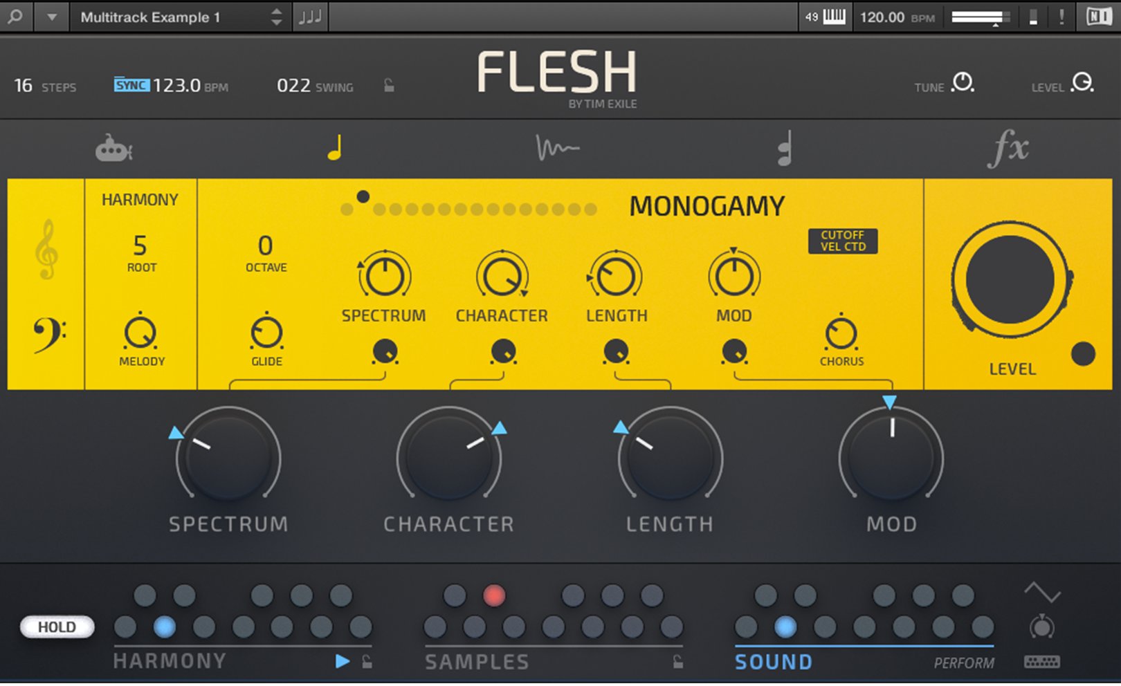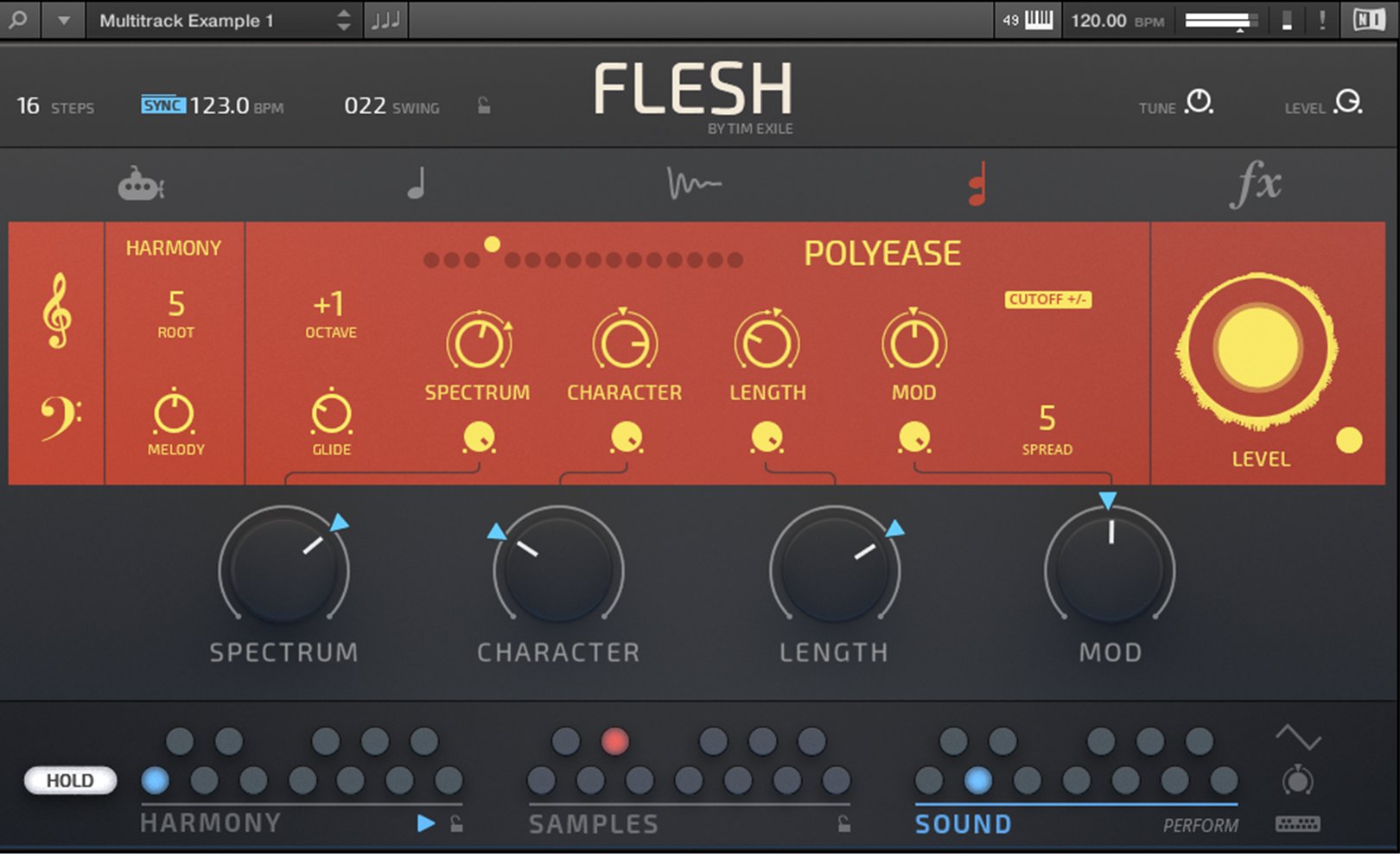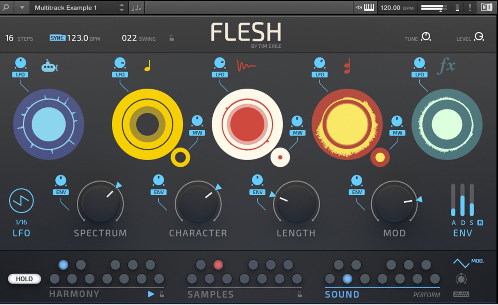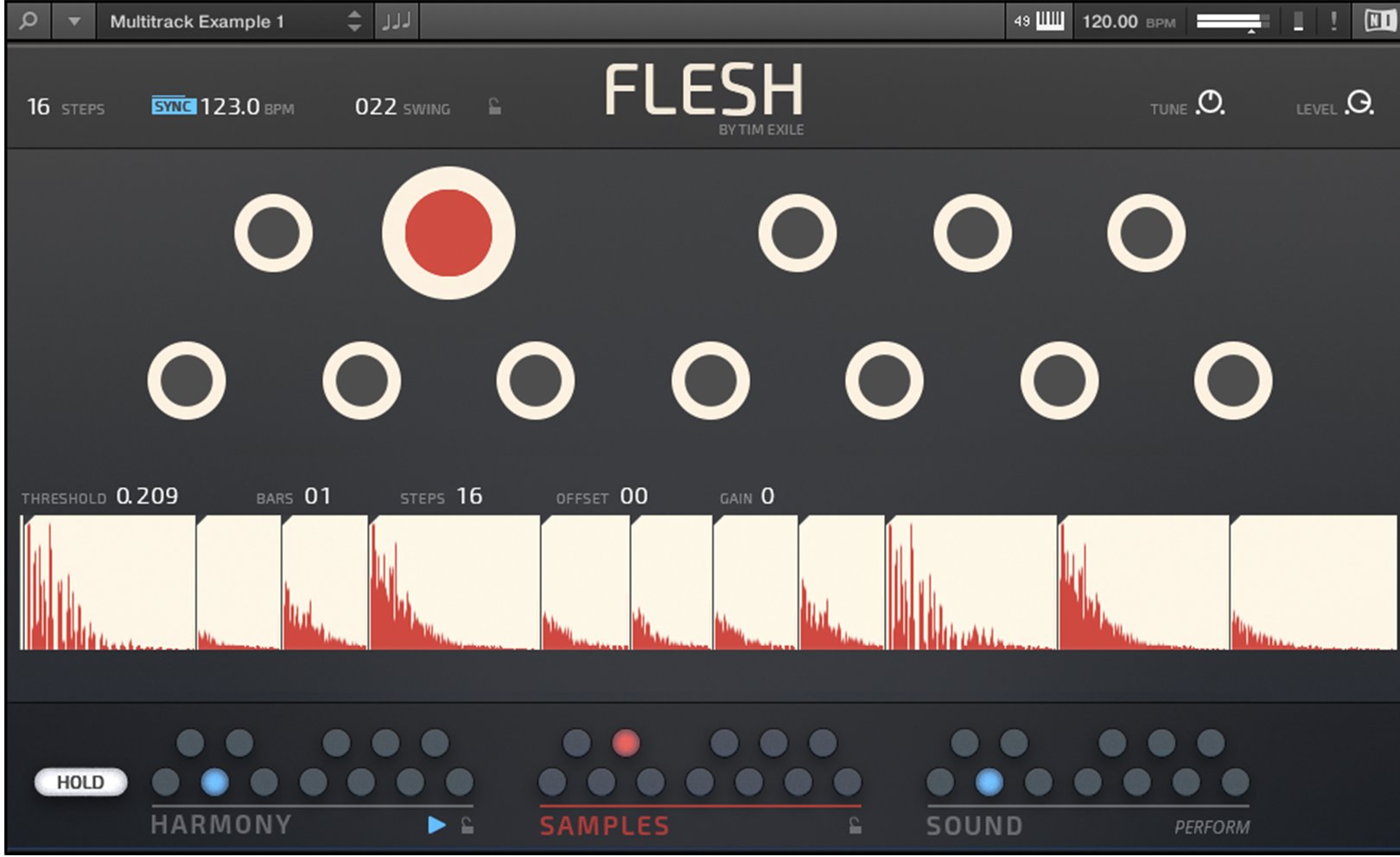 Flesh est conçu pour Reaktor 6 et le Reaktor 6 Player. Tim Exile a développé ici un instrument qui combine synthèses granulaire, à tables d’ondes, un moteur de samples, un générateur de sub à de la modulation et des effets. Il inclut de plus 70 snapshots de lignes de basses, de mélodies, de pads, etc.
