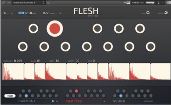 Vous pourrez charger jusqu’à 12 échantillons sonores et Flesh analysera les transitoires et le profil spectral du son, puis transformera ces informations en courbes et triggers qui seront envoyés vers quatre moteurs audio dans le but d’être resynthétisés. Native Instruments précise que tout cela se fait en tâche de fond, et vous permettra notamment de créer des mélodies à partir de rythmes.