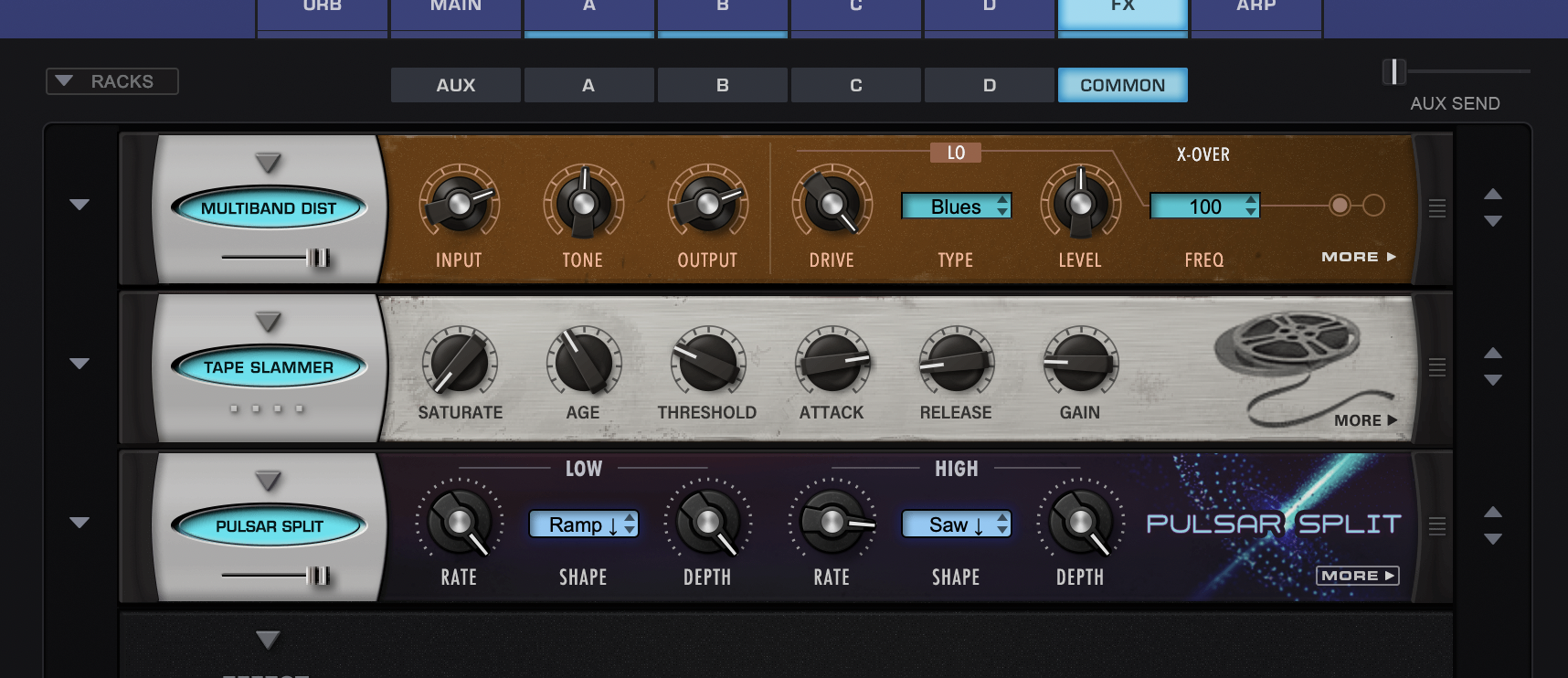 Ceci étant dit, on regrettera surtout le parti pris oldschool des interfaces que nous évoquions plus haut et qui mène parfois à des ergonomies aberrantes. Chaque effet devant tenir dans un rack 1U, Il n’est pas rare qu’on trouve un bouton More sur l’interface pour accéder… à la seconde page du rack… Un rack à pages ? Mon dieu comme c’est pratique !