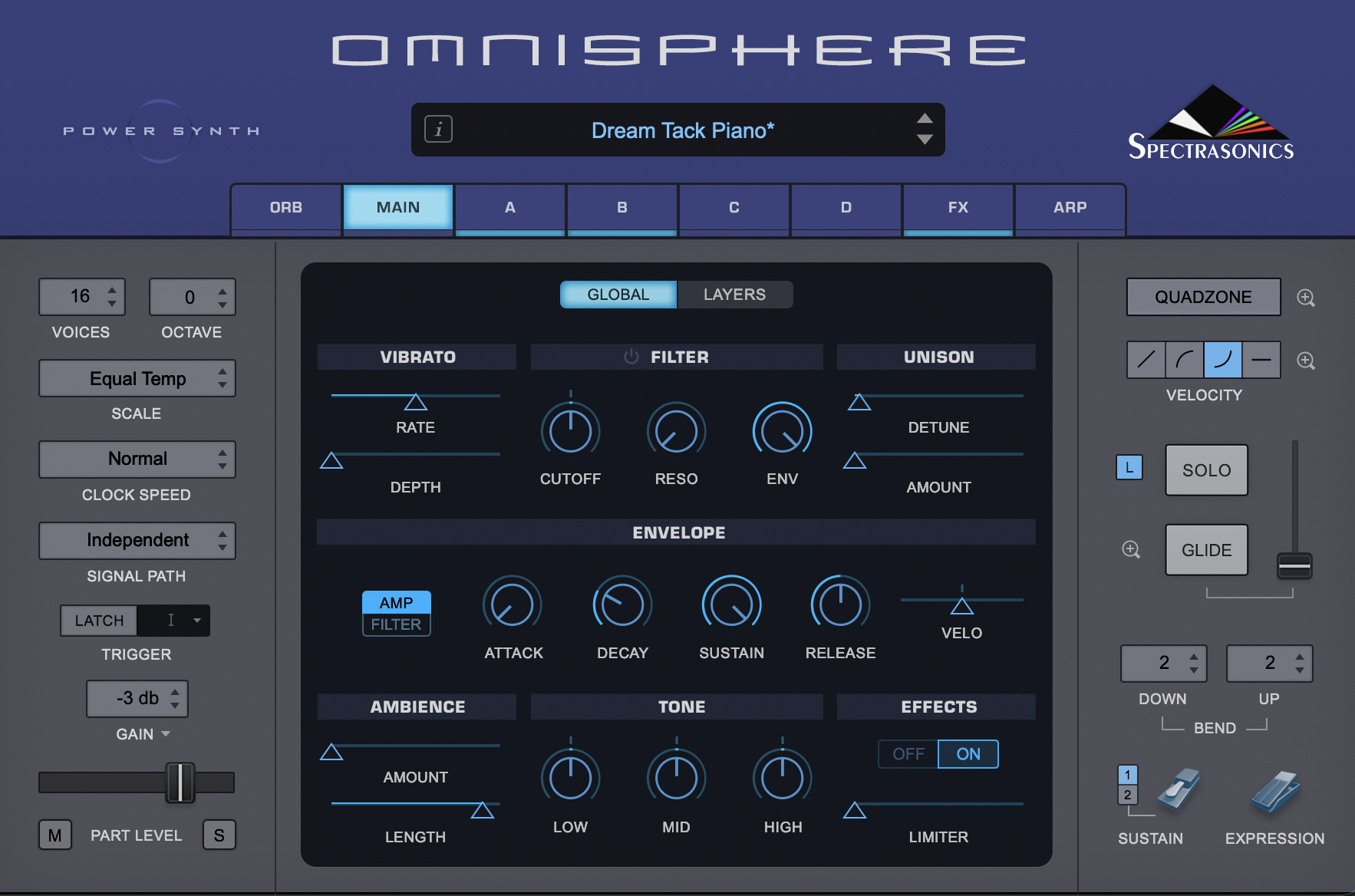 Bref, le terrain de jeu du sound design s’est considérablement agrandi et cela sera d’autant plus intéressant que l’éditeur a bossé sur la compatibilité matérielle de son bébé qui reconnait désormais plus de 300 claviers de contrôle du marché… et parle MPE ! Pour peu que vous disposiez d’un des petits monstres d’Expressive E, Roli ou encore du Push 3 d’Ableton, vous allez redécouvrir Omnisphere comme jamais, goûtant aux joies de faire évoluer ses sons au gré de l’after touch ou du pitch bend polyphoniques. Cela est d’autant plus vrai qu’en plus d’avoir ajouté 18 nouvelles collections de sons, Spectrasonics a revu l’intégralité des anciens présets du logiciel pour qu’ils tirent parti de cette possibilité, comme de la nouvelle section d’effets dont il est doté…
