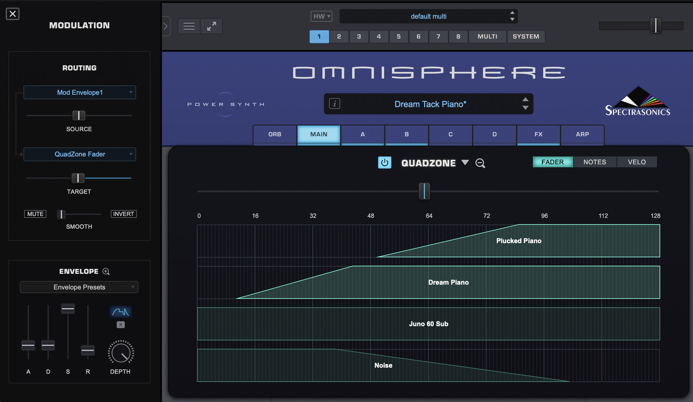Notons-le toutefois : les commandes qui sont à notre disposition se résument, comme depuis le premier Omnisphere, à des boutons, des sliders et des potards. Que ce soit pour éditer une enveloppe, un égaliseur ou un compresseur, n’espérez pas disposer d’interfaces graphiques… « vraiment graphiques » comme chez la plupart des concurrents. Spectrasonics semble privilégier l’ergonomie oldschool…