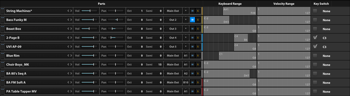 - Éditeur de performances avec affichage des paramètres de niveau, panoramique, pitch, E/S, plage de réponse des notes, vélocité et keyswitches de tous les instruments