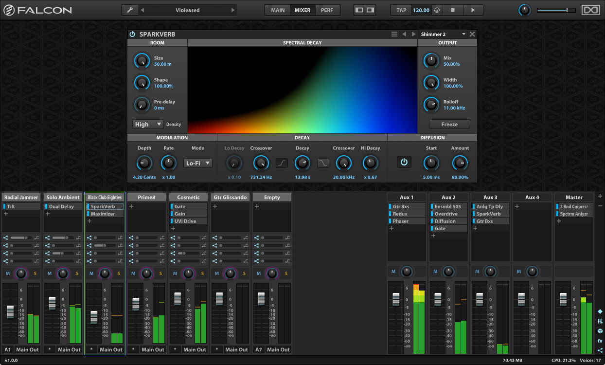 - Plus de 80 effets, dont des délais, réverbes (dont la SparkVerb et une réverbe à convolution), modulation, filtres, égaliseurs, processeurs de stéréo et de dynamique, overdrive, distorsions, compresseurs, effet vinyle, réamping, etc.