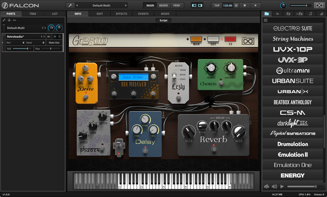 - Processeurs d’évènements, avec notamment un arpégiateur, un micro-accordeur, un générateur d’accords, un harmoniseur, un simulateur de strumming, un lecteur MIDI (vous pourrez manipuler du MIDI externe), des effets Shepherd et d’unisson, etc.