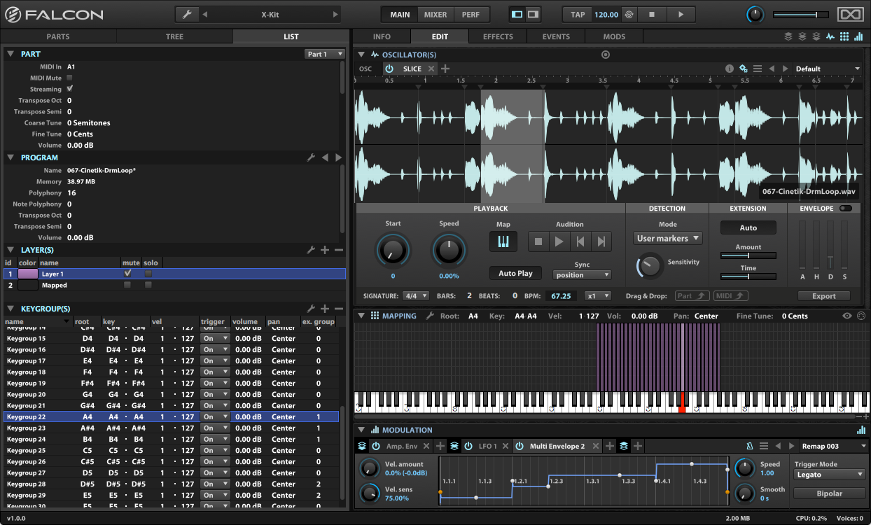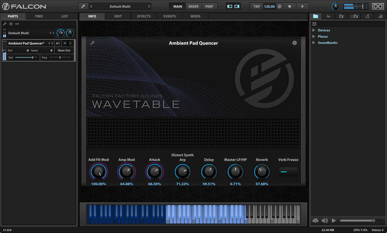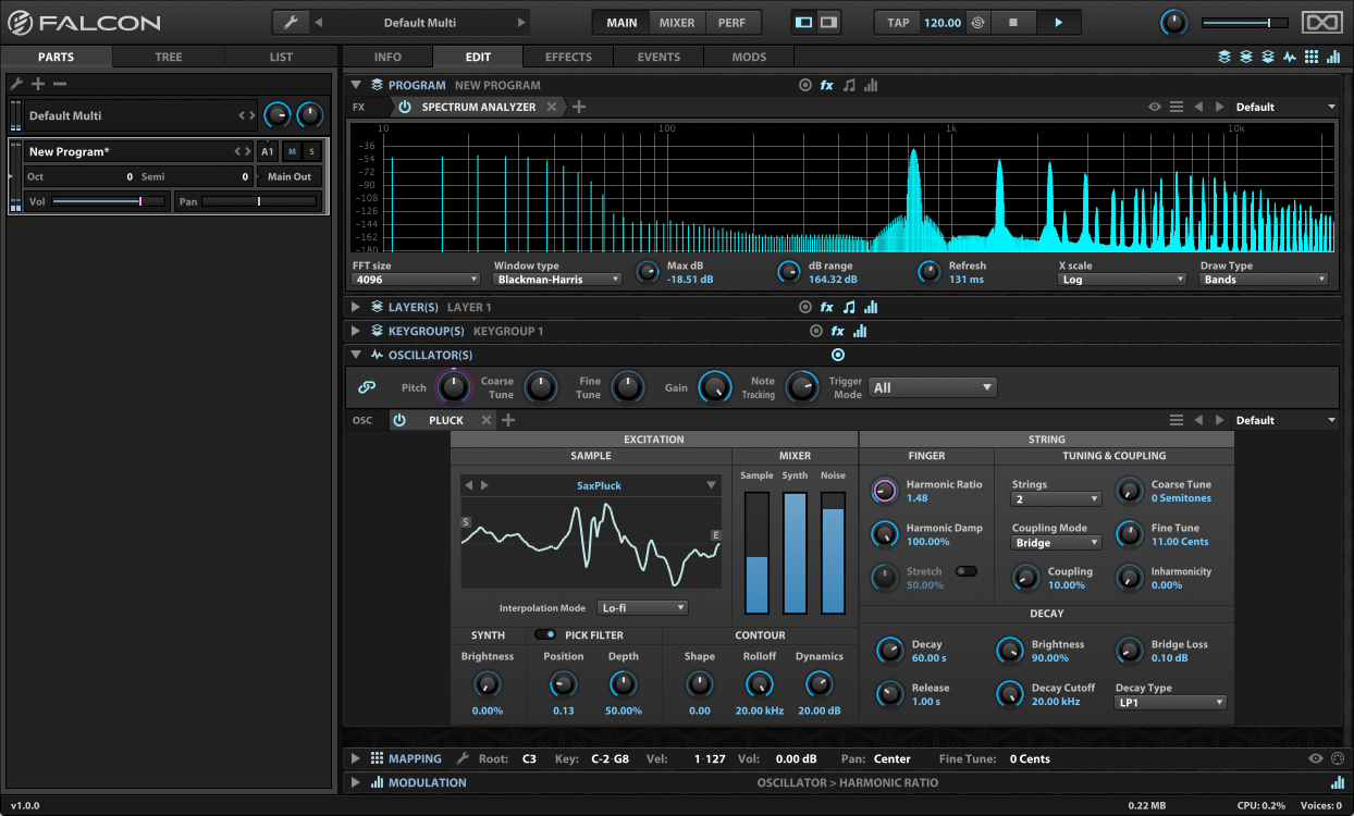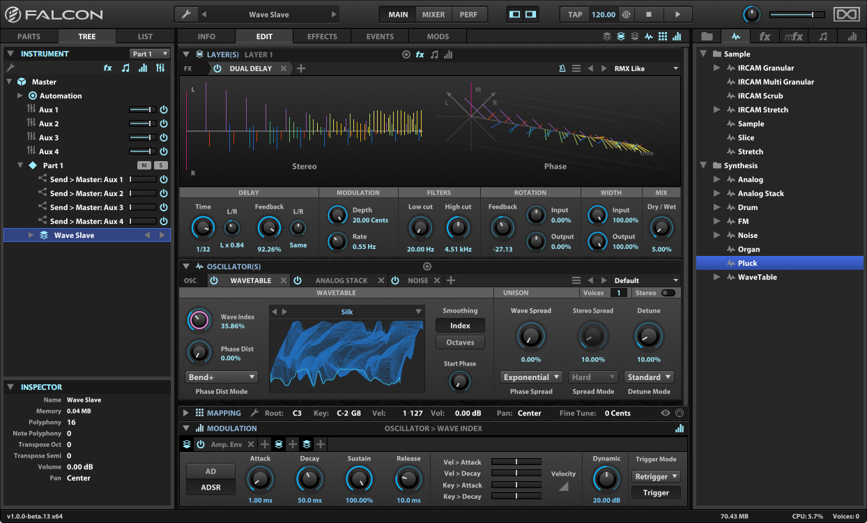 Falcon est présenté comme un instrument virtuel hybride. Il embarque en effet plusieurs types de synthèse, dont de la modulation de fréquence, des tables d’ondes, ainsi que des algorithmes développés par l’IRCAM. Vous avez aussi droit à plus de 80 effets, des générateurs d’évènements, séquenceurs de modulation, des fonctions de slicing d’échantillons sonores et bien plus encore. L’instrument virtuel supporte le format surround jusqu’en 10.2 et vous pourrez même créer des sons à partir d’images et utiliser les sons d’autres banques.