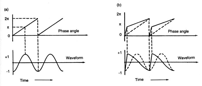Les principales différences par rapport à la synthèse FM résident dans le fait que la modulante – ici la fonction de phase – n’est pas obligatoirement une sinusoïde, et qu’elle est obligatoirement de la même fréquence que la porteuse.