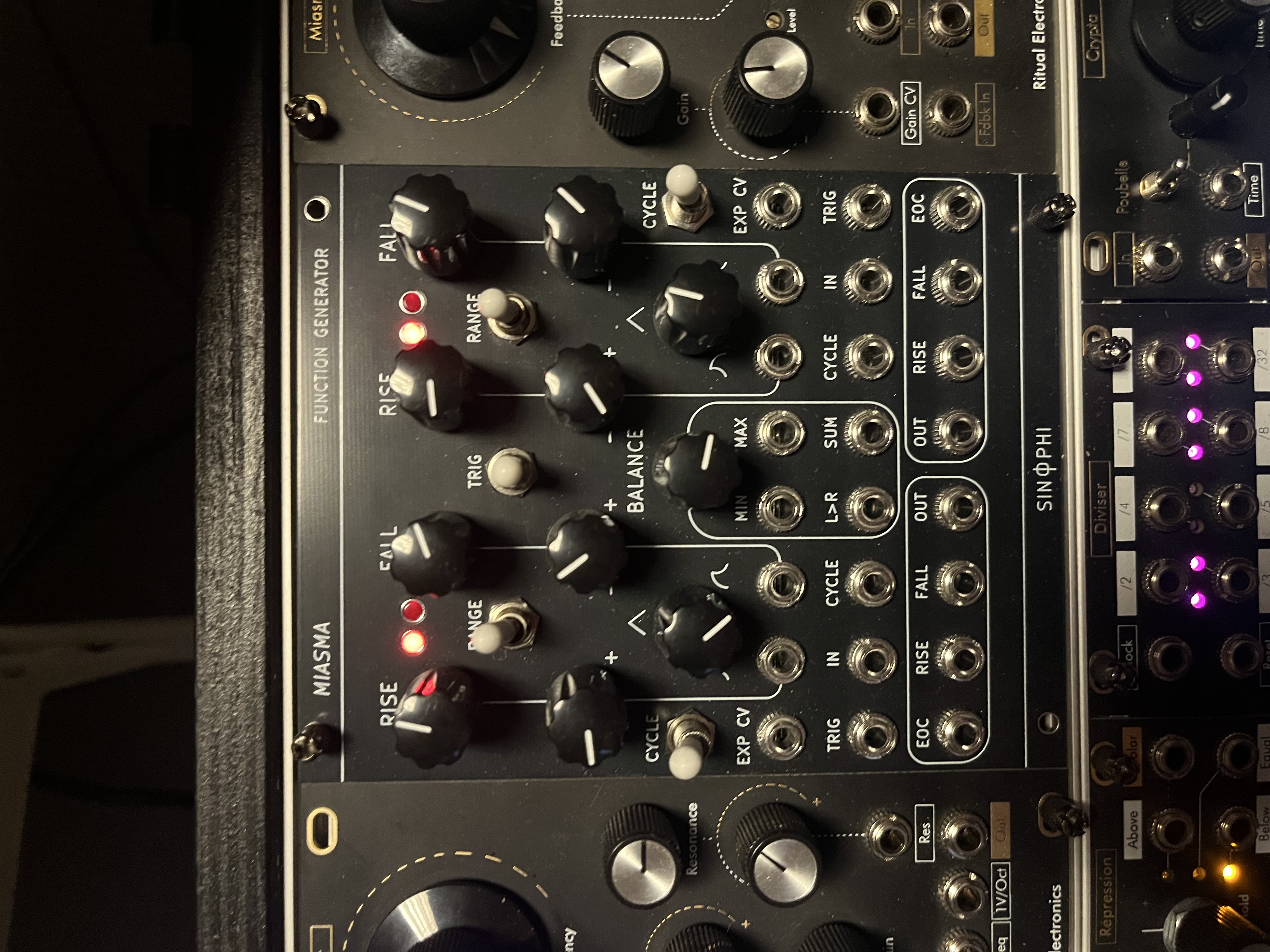 Super modulateur Miasma, projet DIY comparable à un Rampage ou Maths.Il consiste à deux enveloppes avec tous les segments entièrement contrôlables en CV, 4 sorties par modulateur ainsi que 4 sorties du comparateur central.