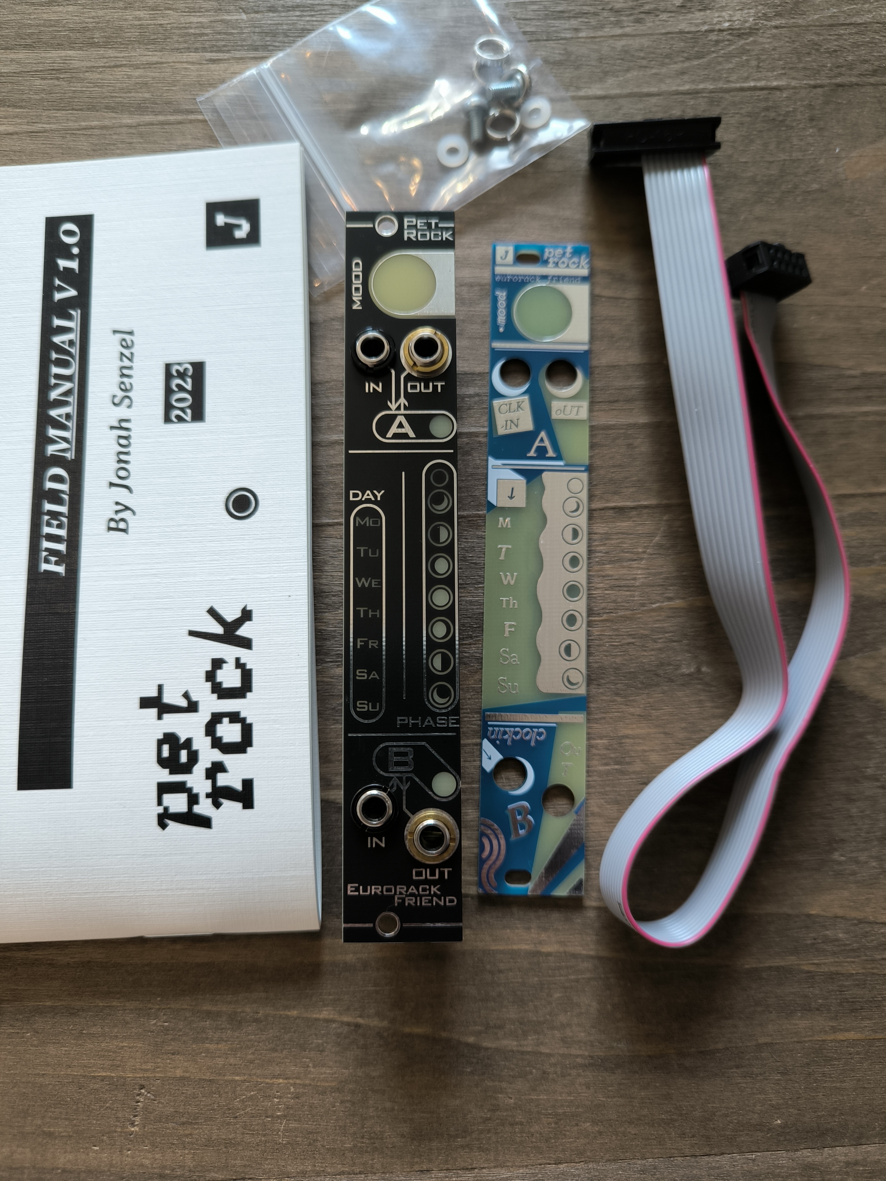 Module Eurorack Pet Rock de Jonah Senzel. petit générateur de rythmes (rogue-like rhythm generator) proposant deux séquences pouvant être influencées par des horloges différentes et dont les motifs changent toutes les 24h. le firmware est calé sur le fuseau horaire GMT+2 (heure d’été d’Europe centrale) et le module est équipé de la façade alternative de Avalon Harmonics en excellent état. vendu avec sa façade d'origine, sa notice et nappe d'alimentation + vis. envoi possible par Mondial Relay.visible sur AudioFanzine, ModularGrid et leboncoin