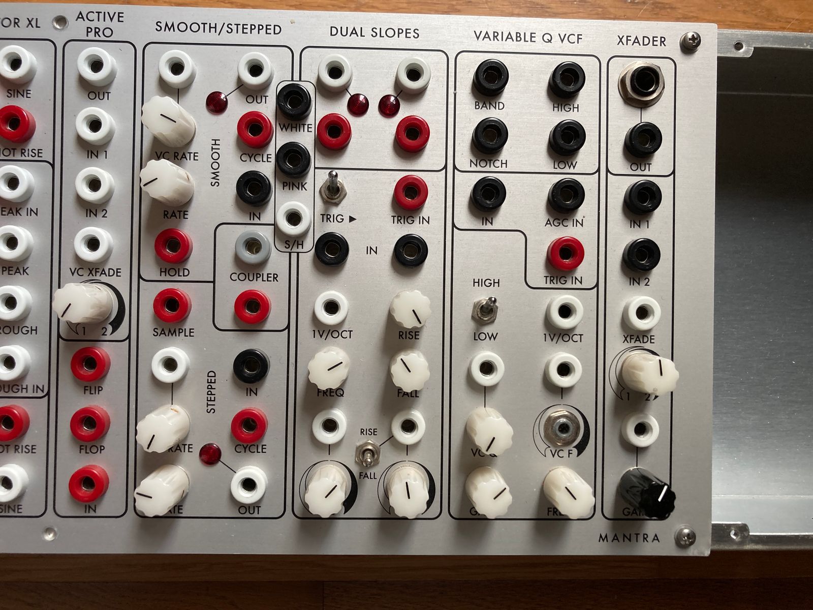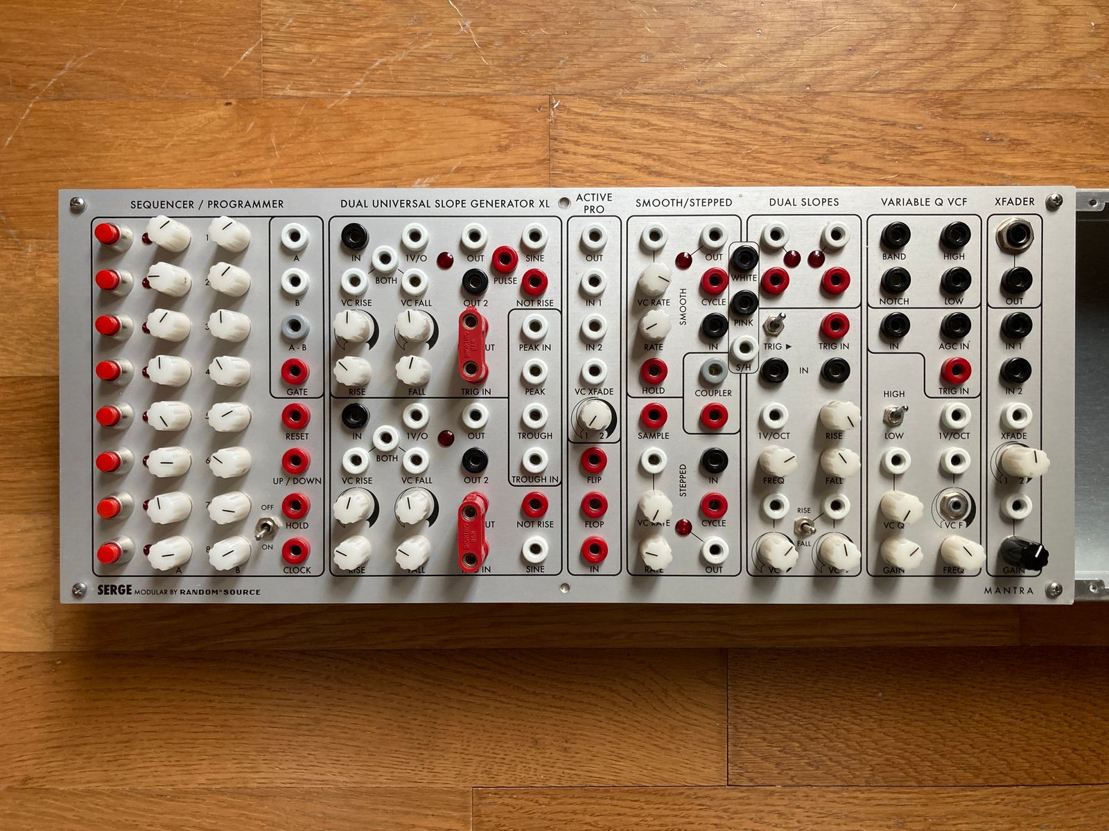 Le Mantra est un synthétiseur complet et l'un des panels R*S les plus puissants. Il possède un double séquenceur CV, un DUSG (module SERGE classique offrant enveloppes, VCO, filtres…), un processeur CV, des fonctions Peak et Through, un SSG (tensions aléatoires progressives et échelonnées, double slope, le fameux VCFQ – à mon avis le meilleur filtre de chez Serge) et un VCA/mixeur à deux entrées.