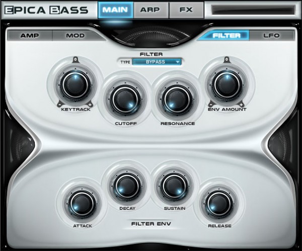 - Section de filtre avec 6 types de filtre, résonance, coupure et enveloppe ADSR, suivi de clavier et quantité