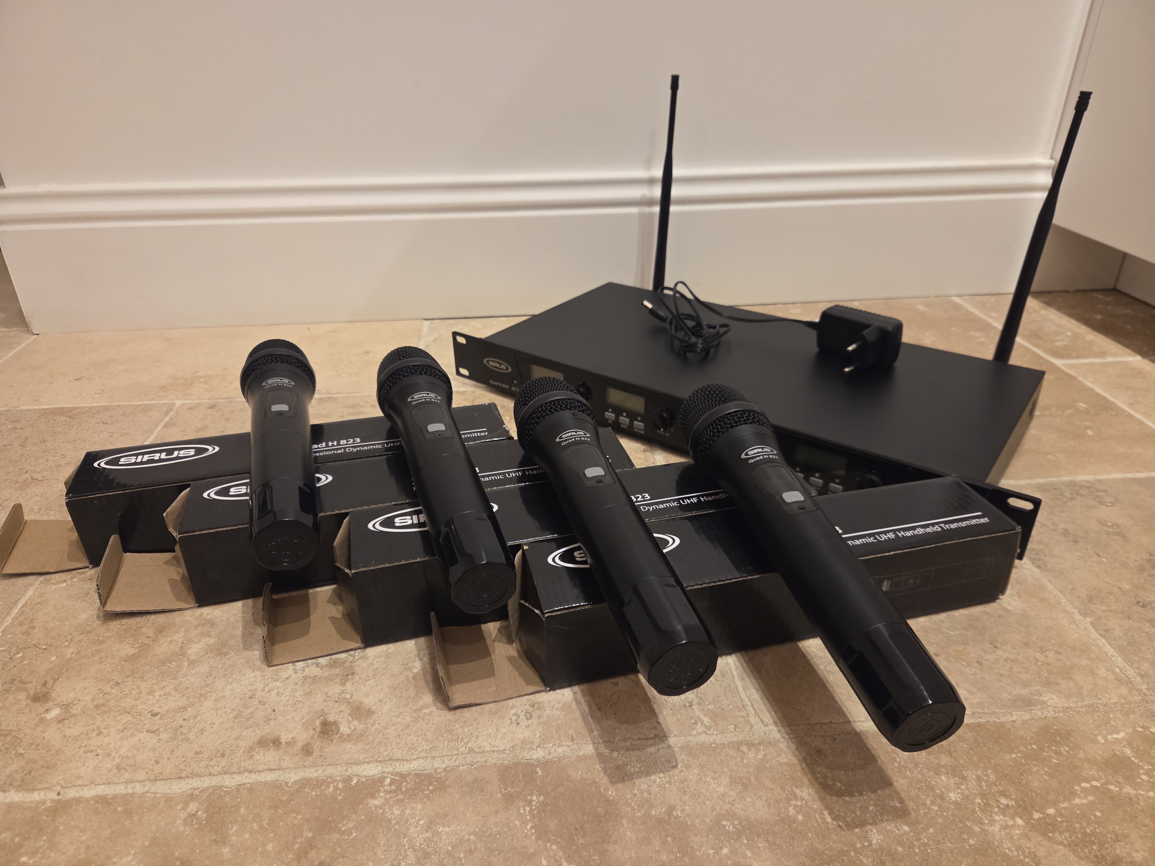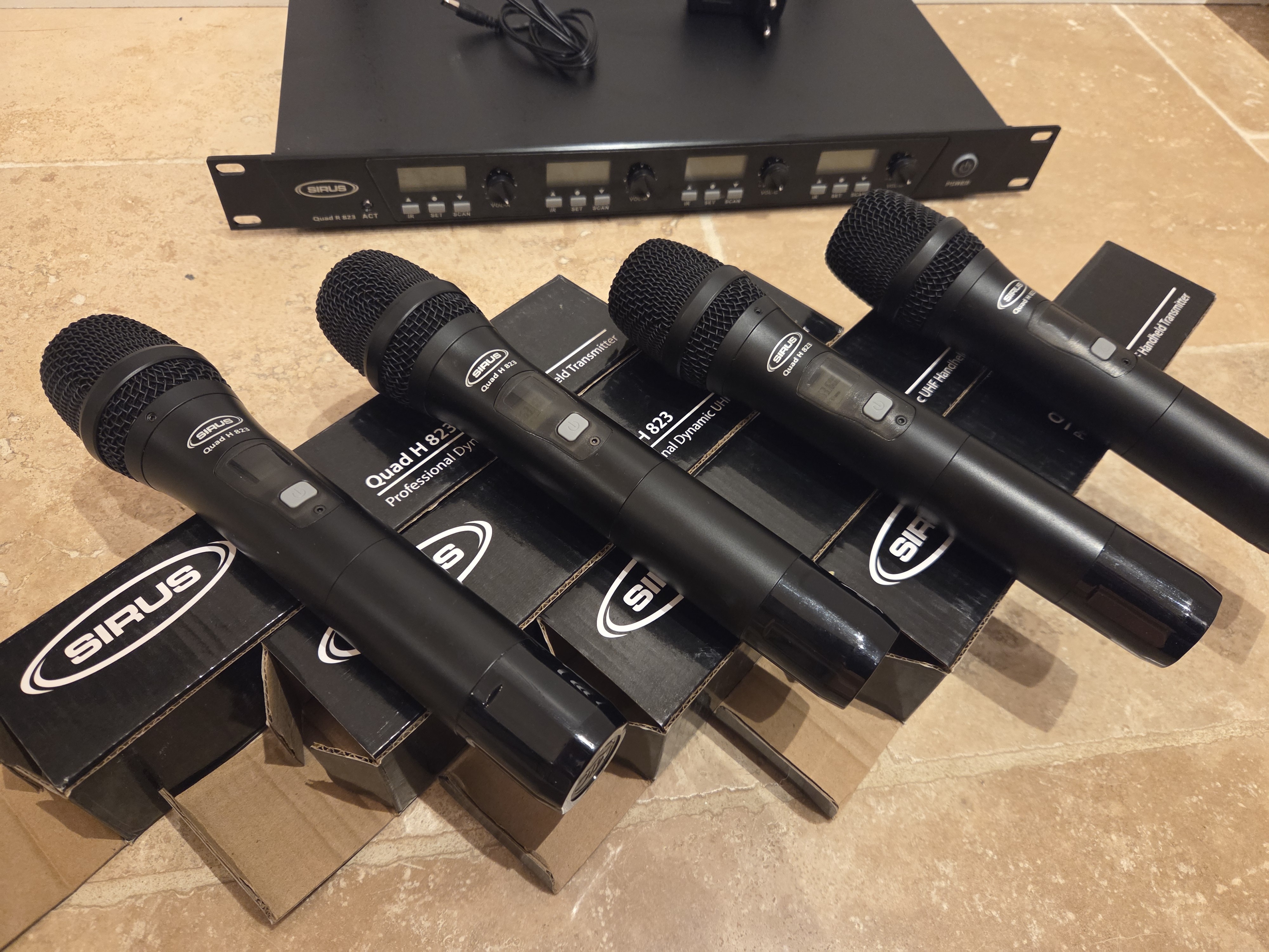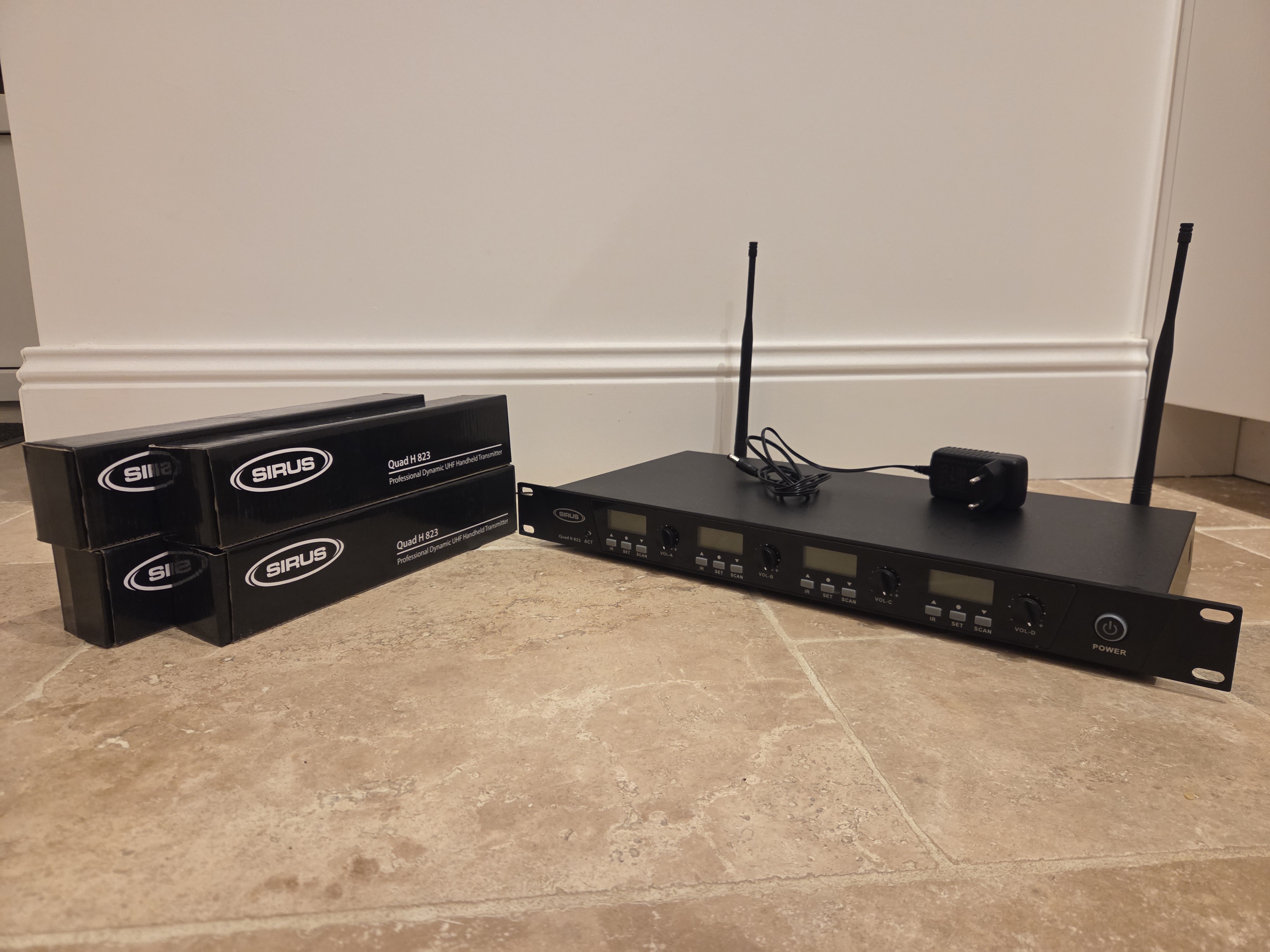 Je vends ce récepteur sans fil Sirus Quad R avec 4 micros H 823, idéal pour vos prestations audio.