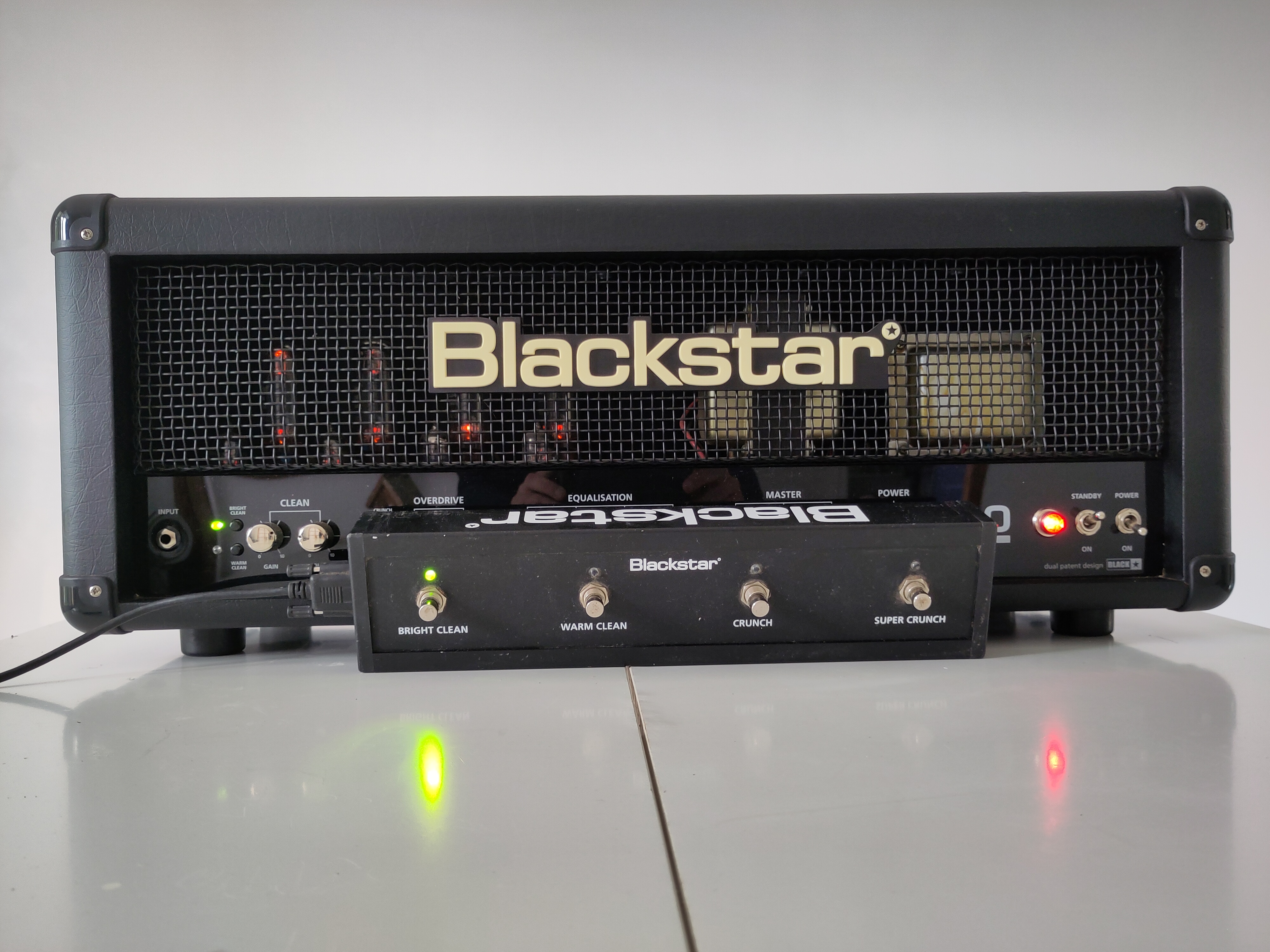 Tête d'ampli Blackstar 100W à lampes acheté fin 2010 vendu avec footswitch et flightcase.Ampli versatile grâce à un bouton permettant de passer d'un son typé américain à anglais ou de mélanger les deux.