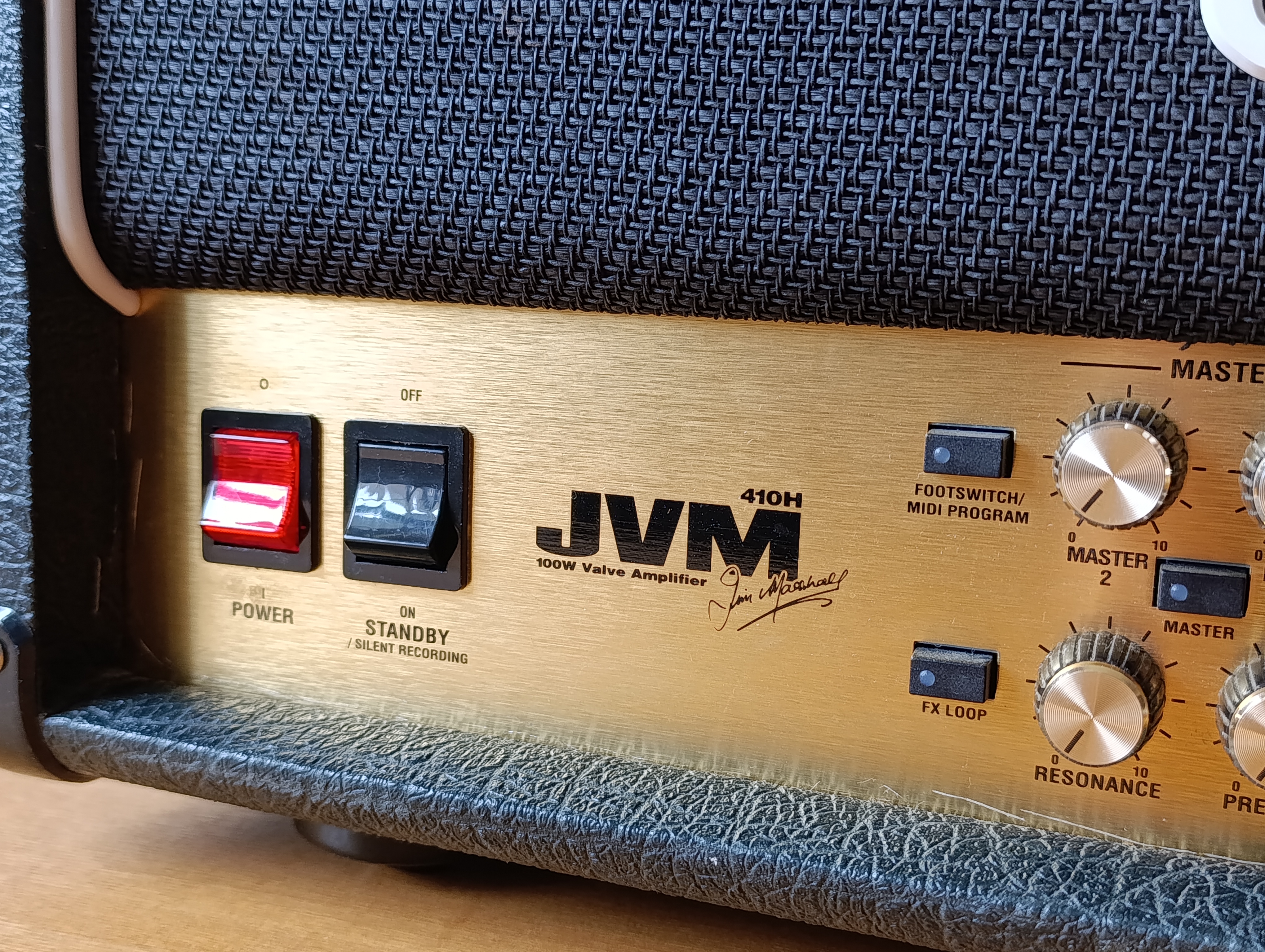 Je mets en vente cette tête JVM 410H 100w, l’ampli le plus complet et le plus moderne dans l’esprit chez Marshall. Je teste différents amplis ces derniers temps et j’ai pu mettre la main sur celui-ci qui sonne très bien. Finalement un peu trop pour moi, je le revends pour me prendre un plexi tout simple et continuer mes explorations.Il a été checké par un technicien, une résistance a été changée, il est biasé correctement. Les lampes sont assez récentes, un peu plus d’un an sans utilisation intensive. Il est entièrement fonctionnel, vendu avec son footswitch et son alim (et je remets la grille arrière en place pour la vente). Quelques petits défaut esthétiques dont une rayure sur le panneau avant, et un accro sur le dessous.