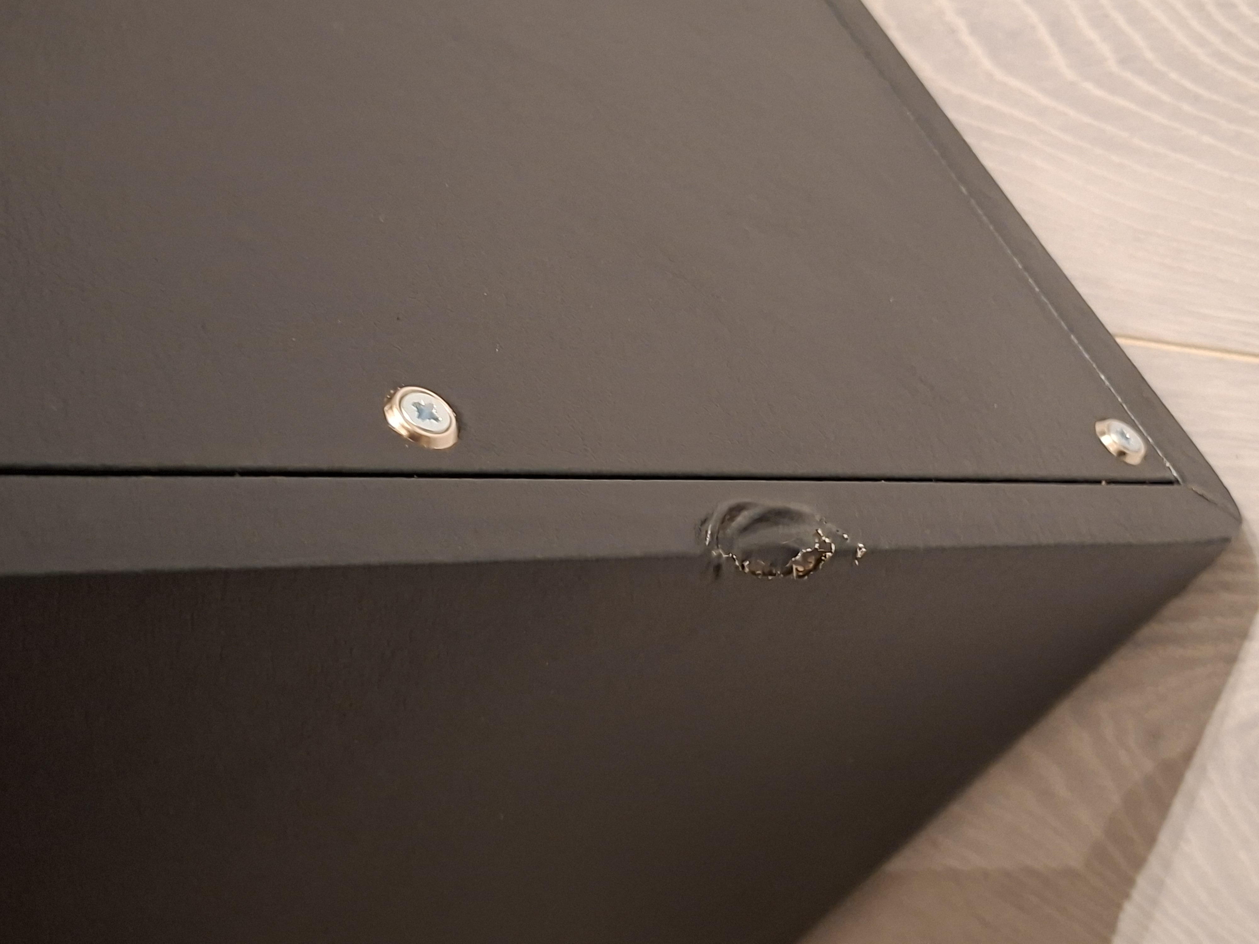 Baffle impeccable également mais une trace de choc sur la tranche arrière, non visible de face, n'impacte aucunement le son et acheté comme cela. voir dernière photo.