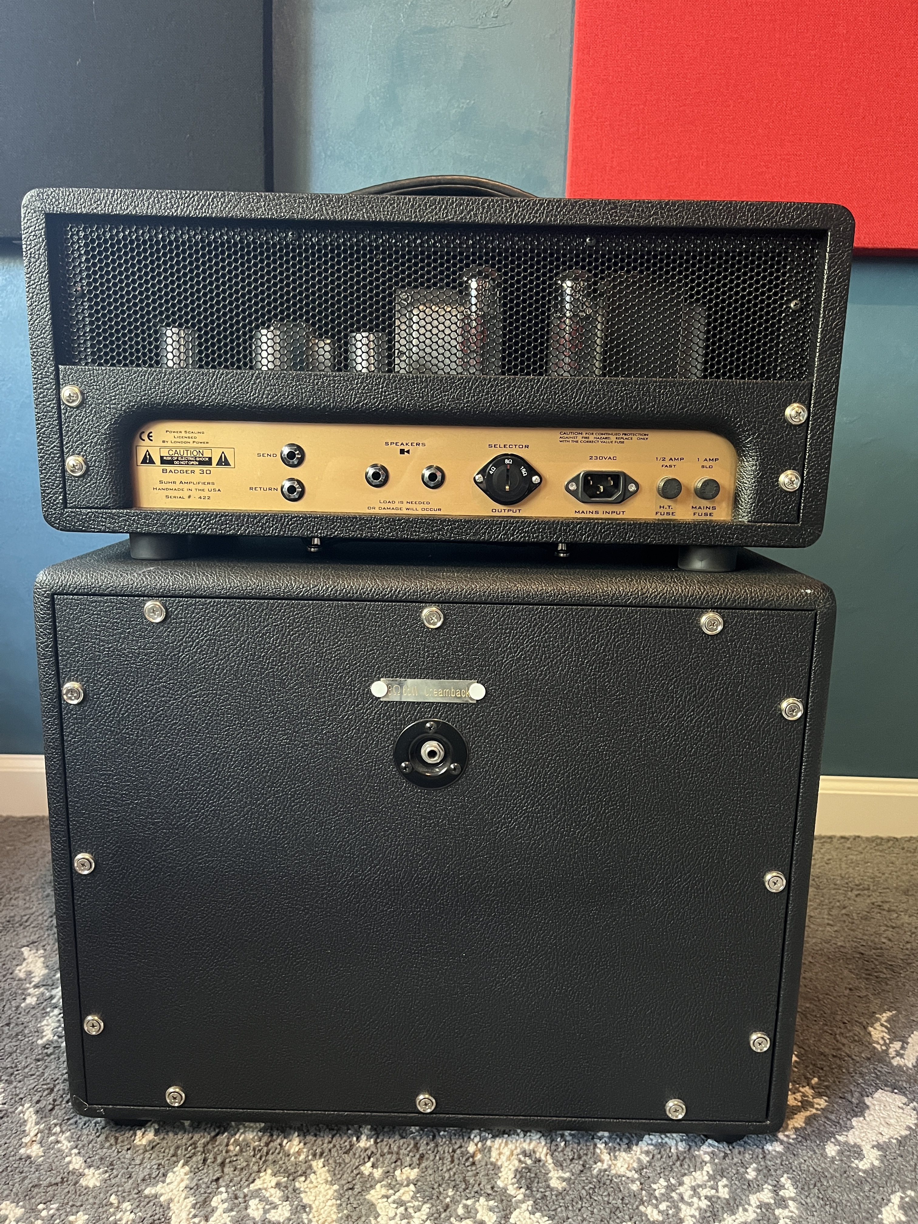 Suhr Badger 30 et son cab Suhr 1X12 monté avec un celestion creamback 8 Ohm