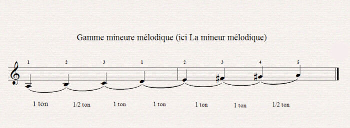 À noter que si la gamme mélodique « fonctionne » en montant vers les aigus, elle sonne de manière plus étrange en redescendant vers les graves, car dans ce cas l’oreille s’attend à avoir une gamme majeure. On emploie alors plutôt la gamme mineure naturelle pour descendre, ce qui vaut à cette dernière sa seconde dénomination de « gamme mineure mélodique descendante », comme on peut l’entendre dans cet exemple (montée en mineur mélodique et descente en mineur naturelle) :