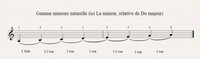 La gamme mineure relative d’une gamme majeure s’appelle une gamme mineure « naturelle ». Attention, ce n’est pas parce que les toniques sont à un ton et demi d’écart que toutes les autres notes le sont ! Si c’était le cas, la gamme relative d’une gamme majeure serait… une autre gamme majeure ! Voici donc le mode de construction d’une gamme mineure :