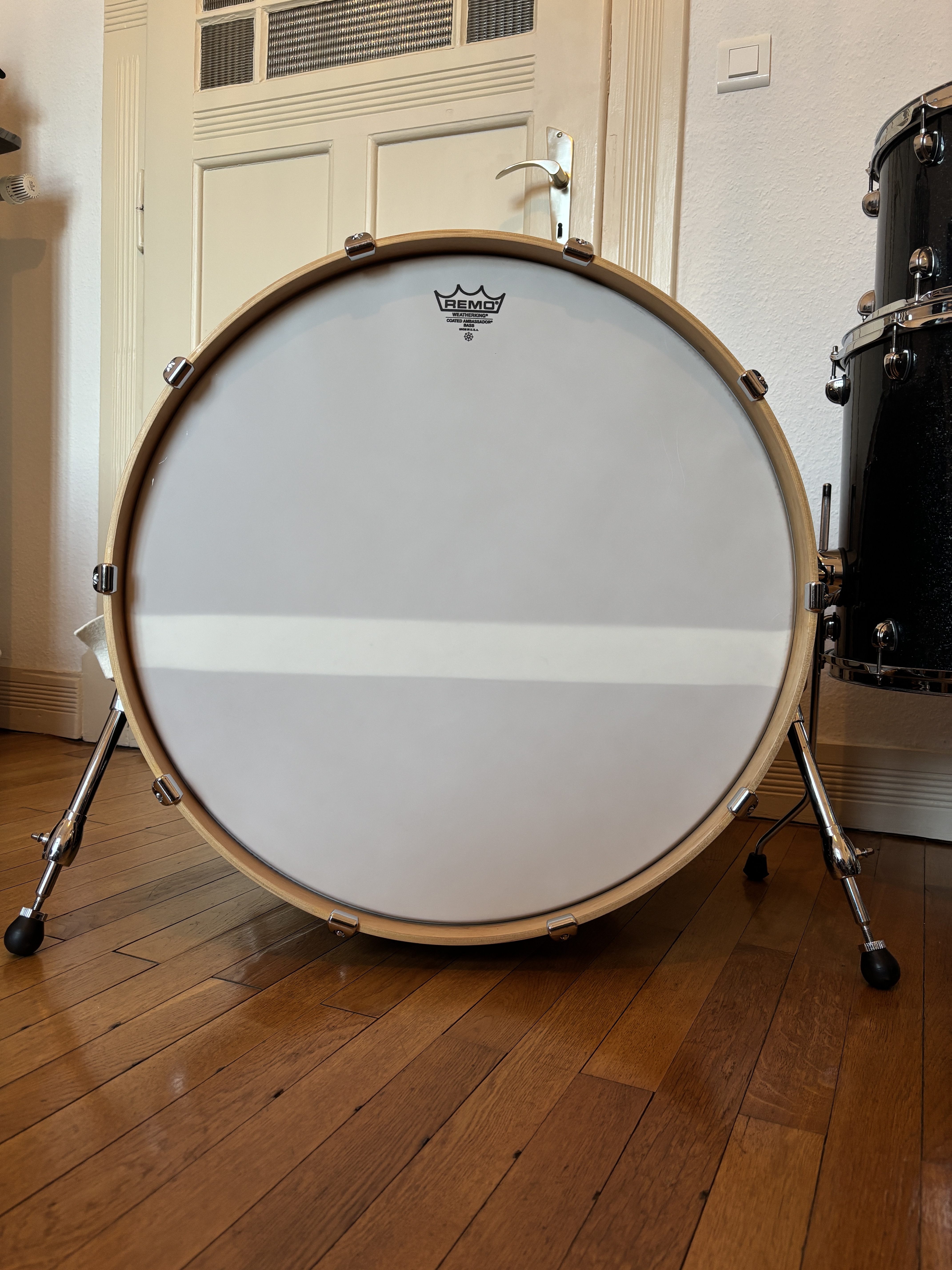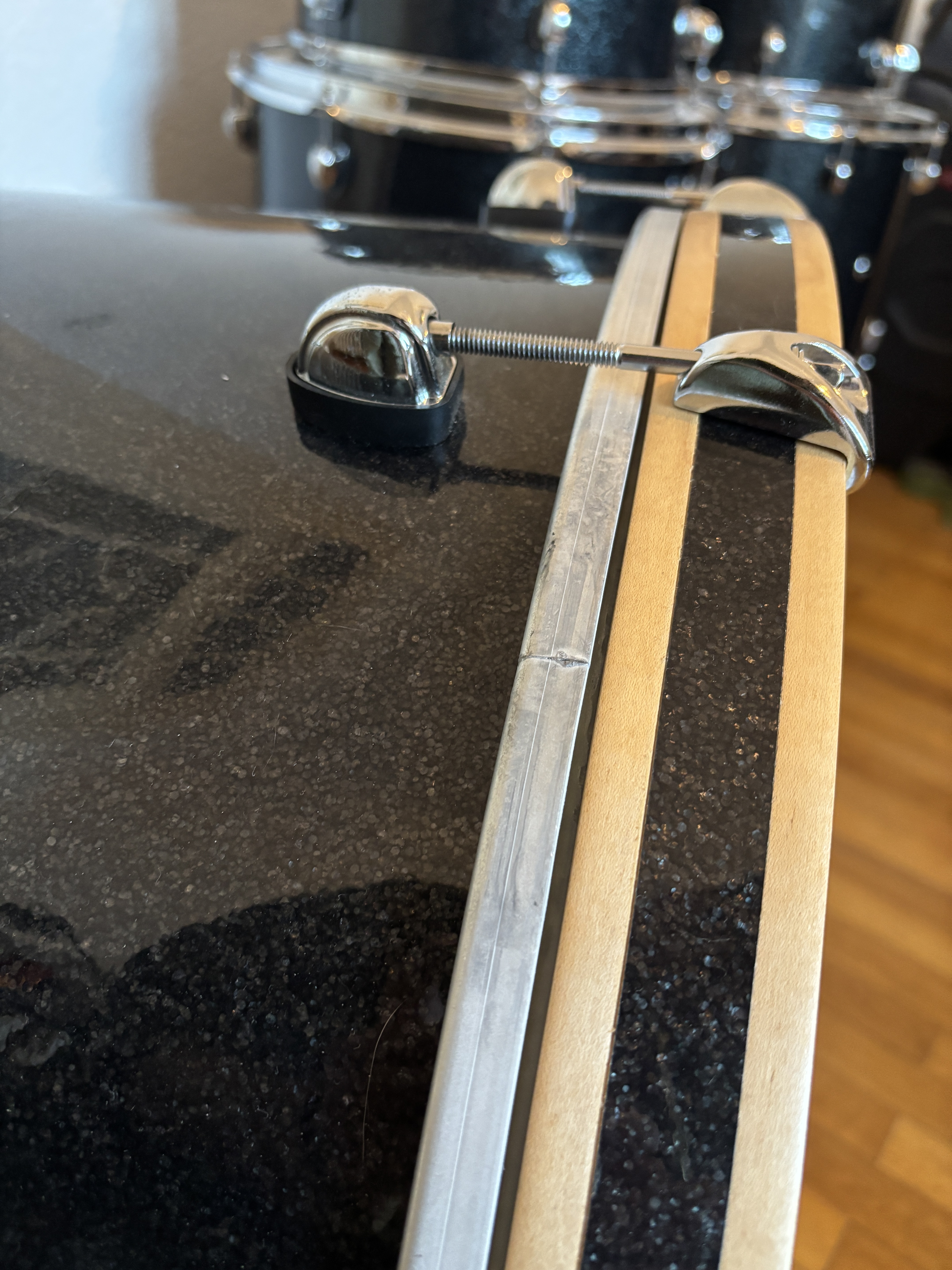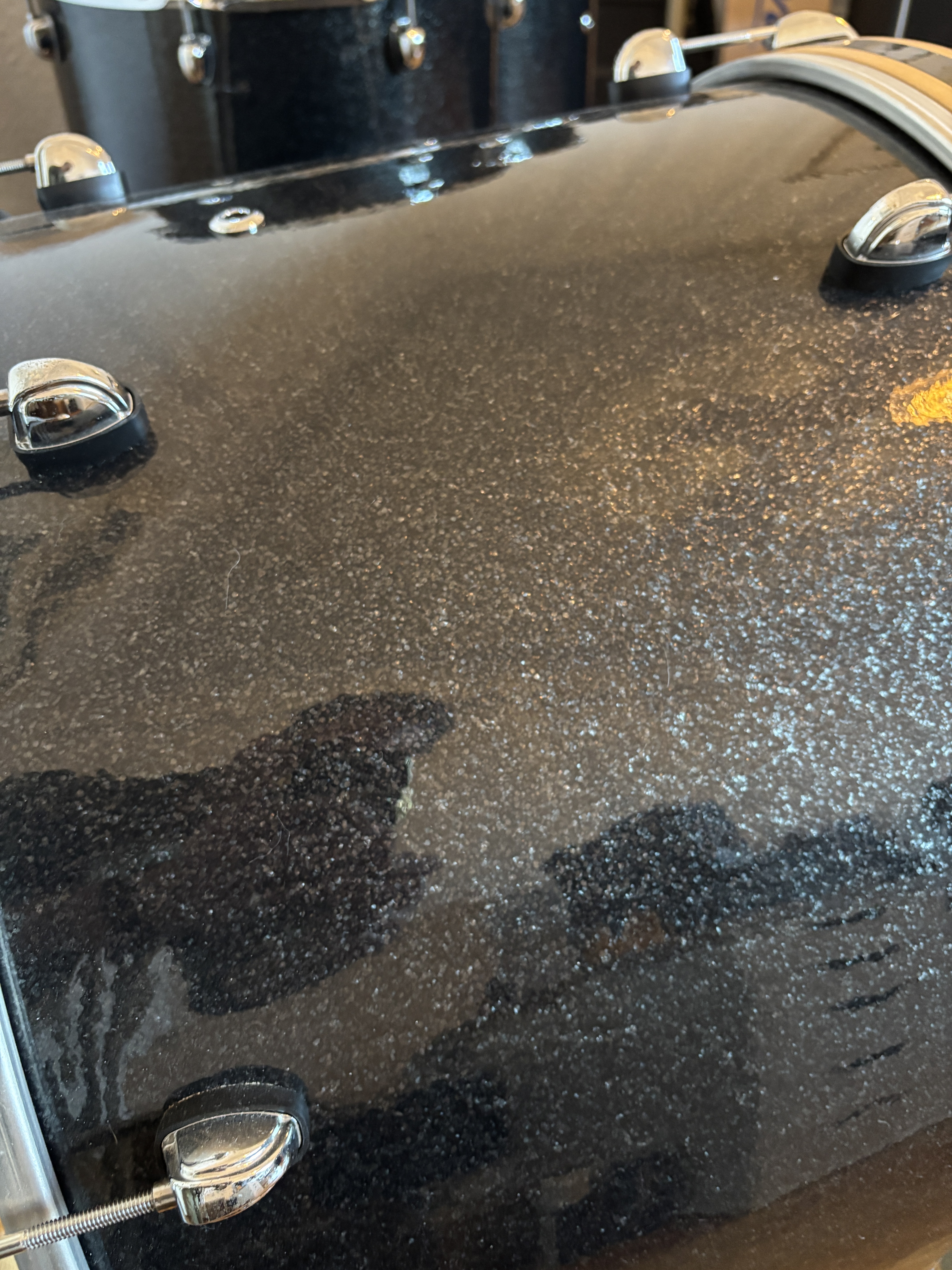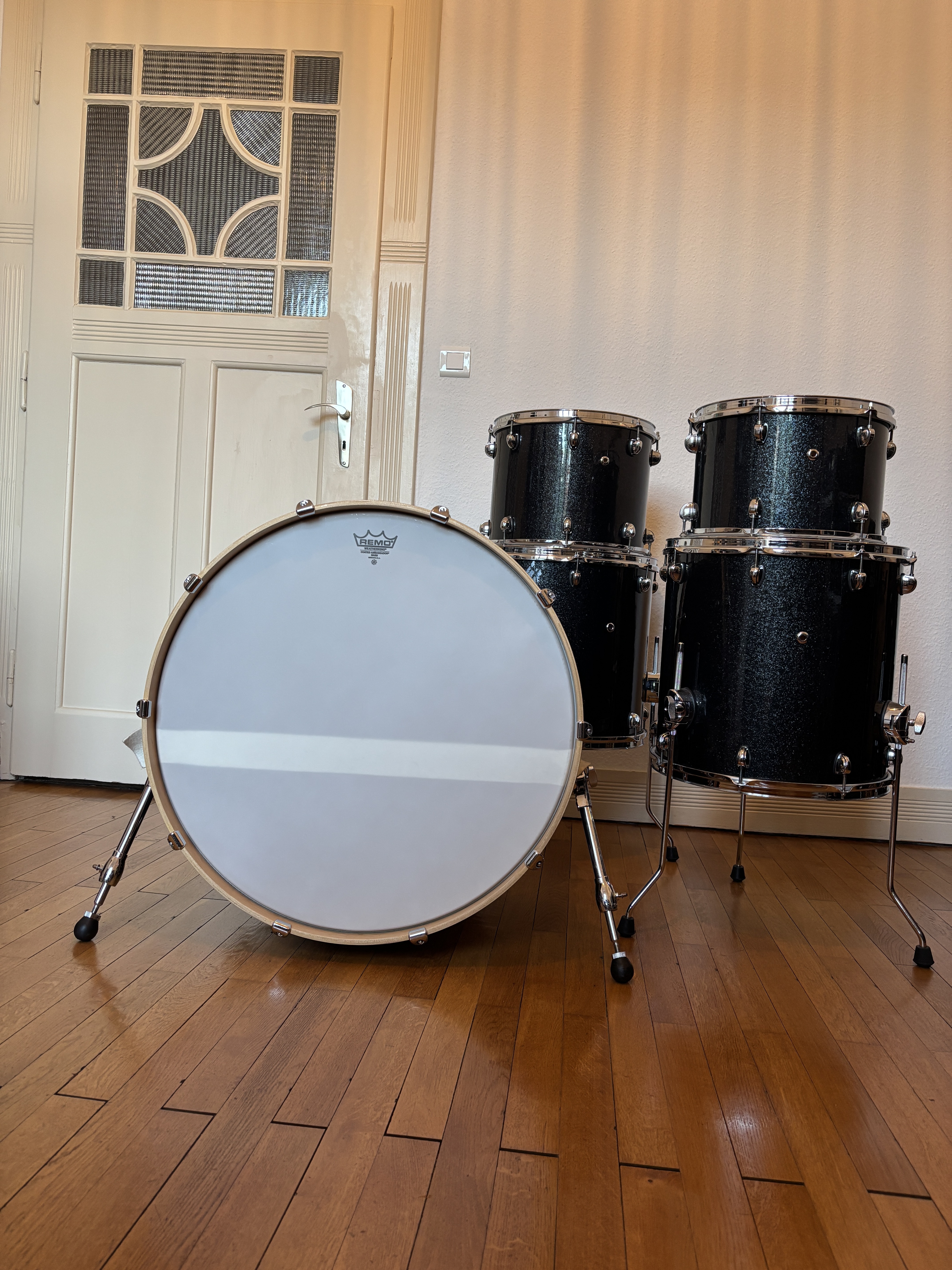 La batterie a été entièrement décapée, puis rewrappée avec un rhodoïd Delmar Black Sparkle made in USA. Les cerclages de la grosse caisse ont été modifiés par St Drums pour y insérer un inlay assorti.