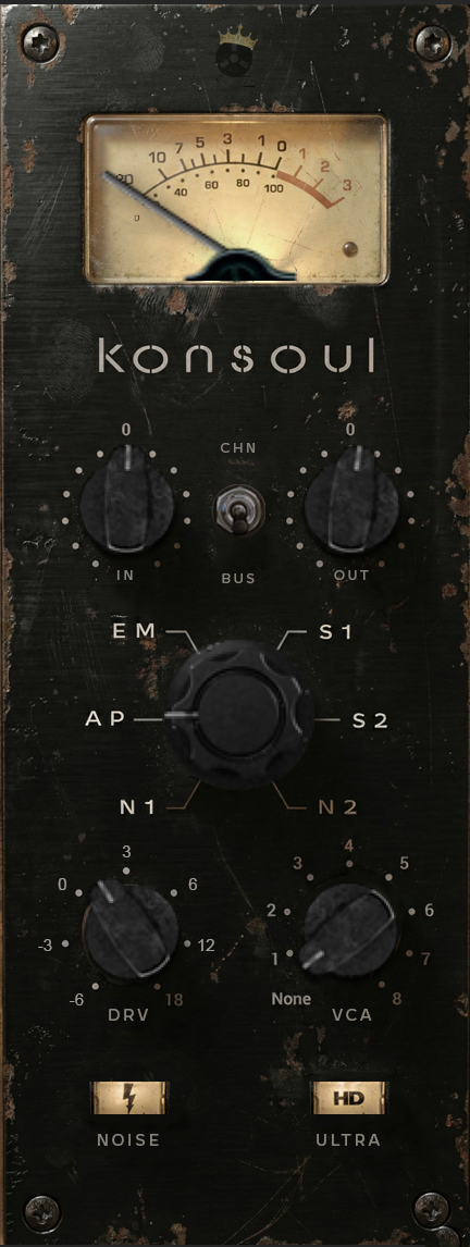Un contrôle de Drive permet d’ajuster le niveau de saturation, tandis qu’un algorithme VCA vise à renforcer la cohésion et la sensation de mouvement sans recourir à une compression classique. Konsoul intègre également un système de gestion par groupes synchronisés, où plusieurs instances peuvent être liées entre elles afin que les réglages effectués sur une piste soient répercutés instantanément sur l’ensemble du groupe. Enfin, un générateur de bruit optionnel et un mode commutable HD sont disponibles.