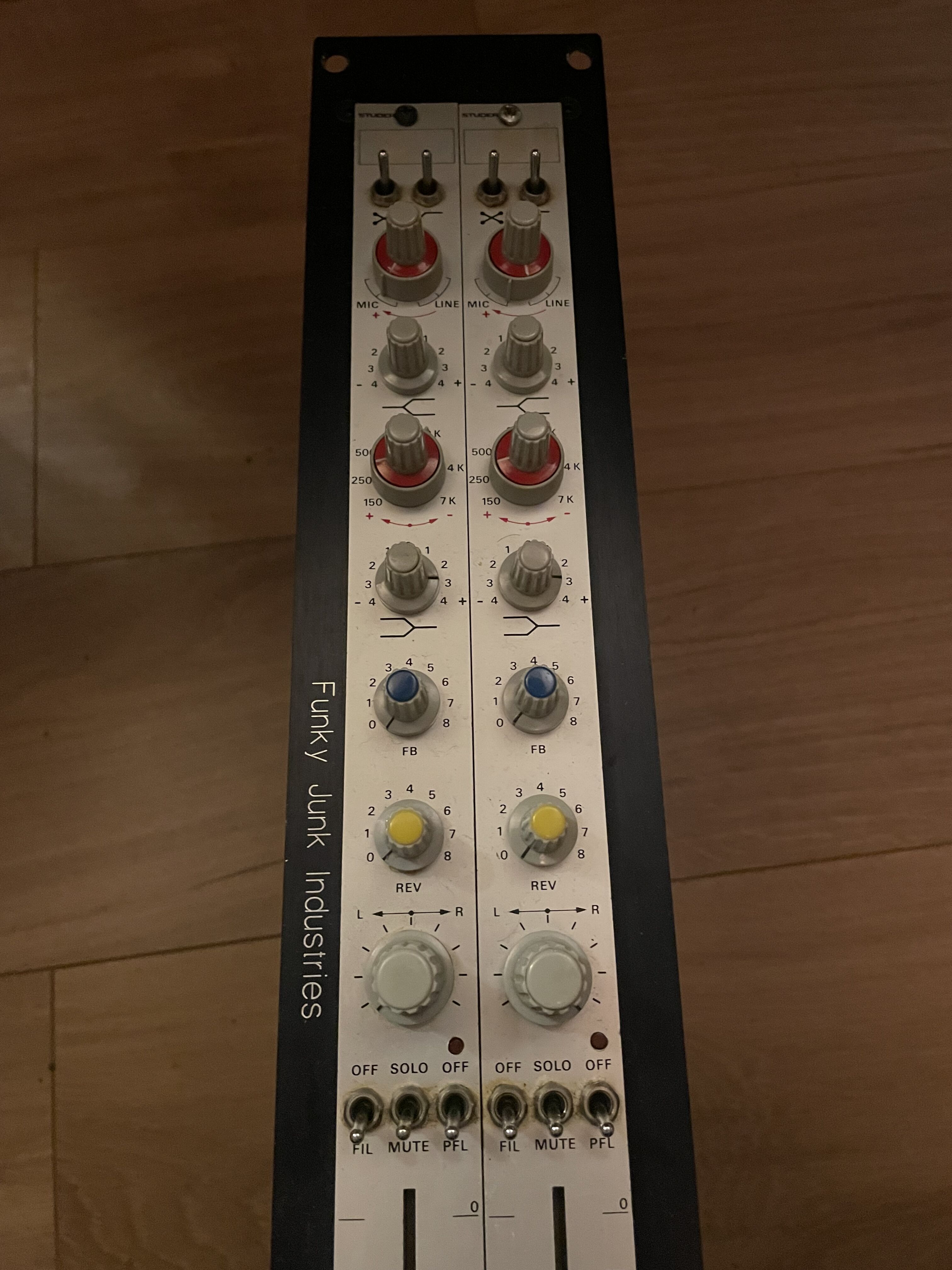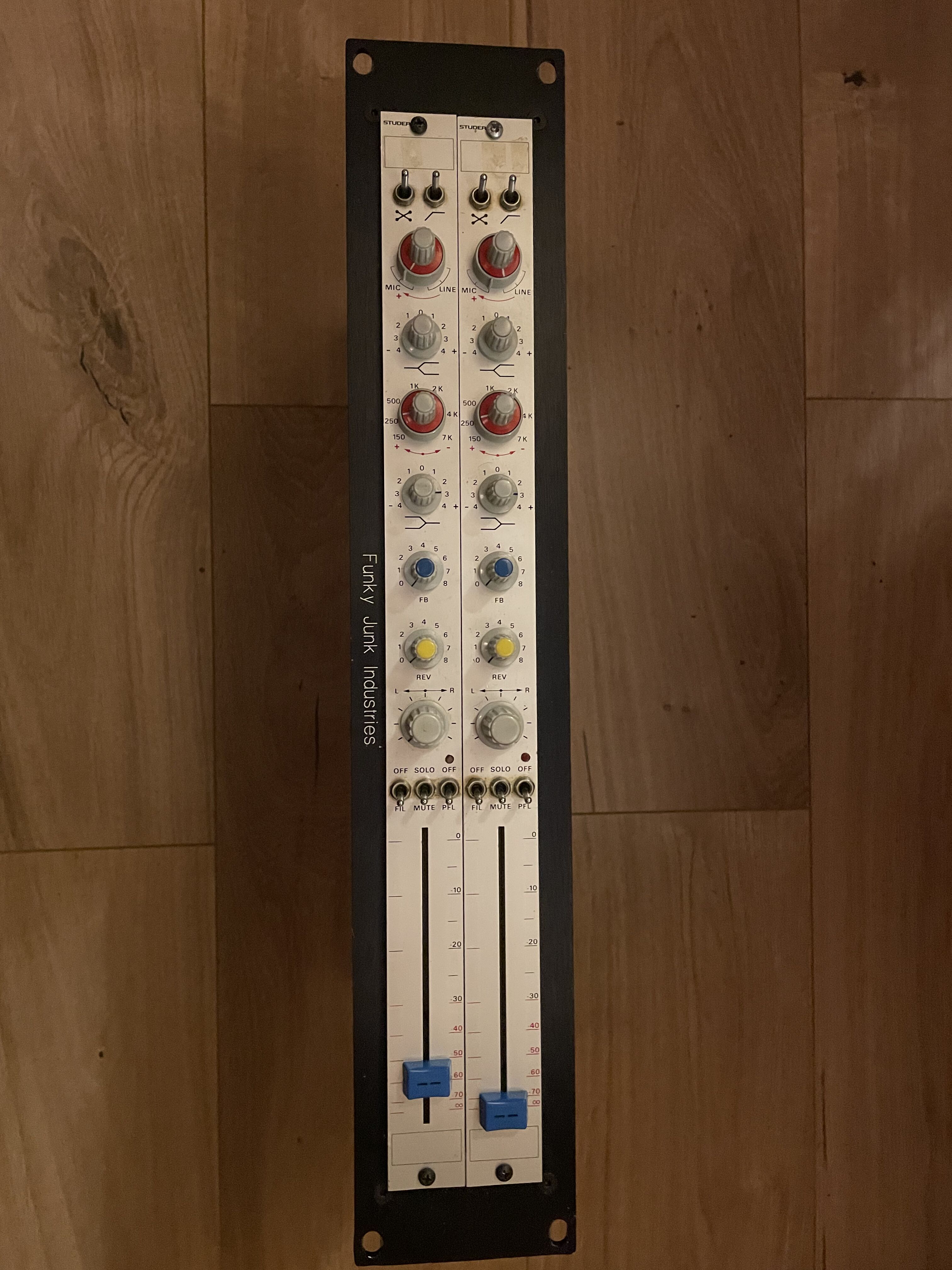 onjour,Je vends cette paire de tranches de console originale Studer 169, mise en rack par Funky Junk. Elles fonctionnent parfaitement et sonnent d’enfer. Elles possèdent une EQ très musicale et l’alimentation fantôme est s’active via le bouton PFL (modification Funky Junk). Elles sont équipées d’une EQ 3 bands, d’une inversion de phase et d’un low-cut. Elles sont au format rack 19’.