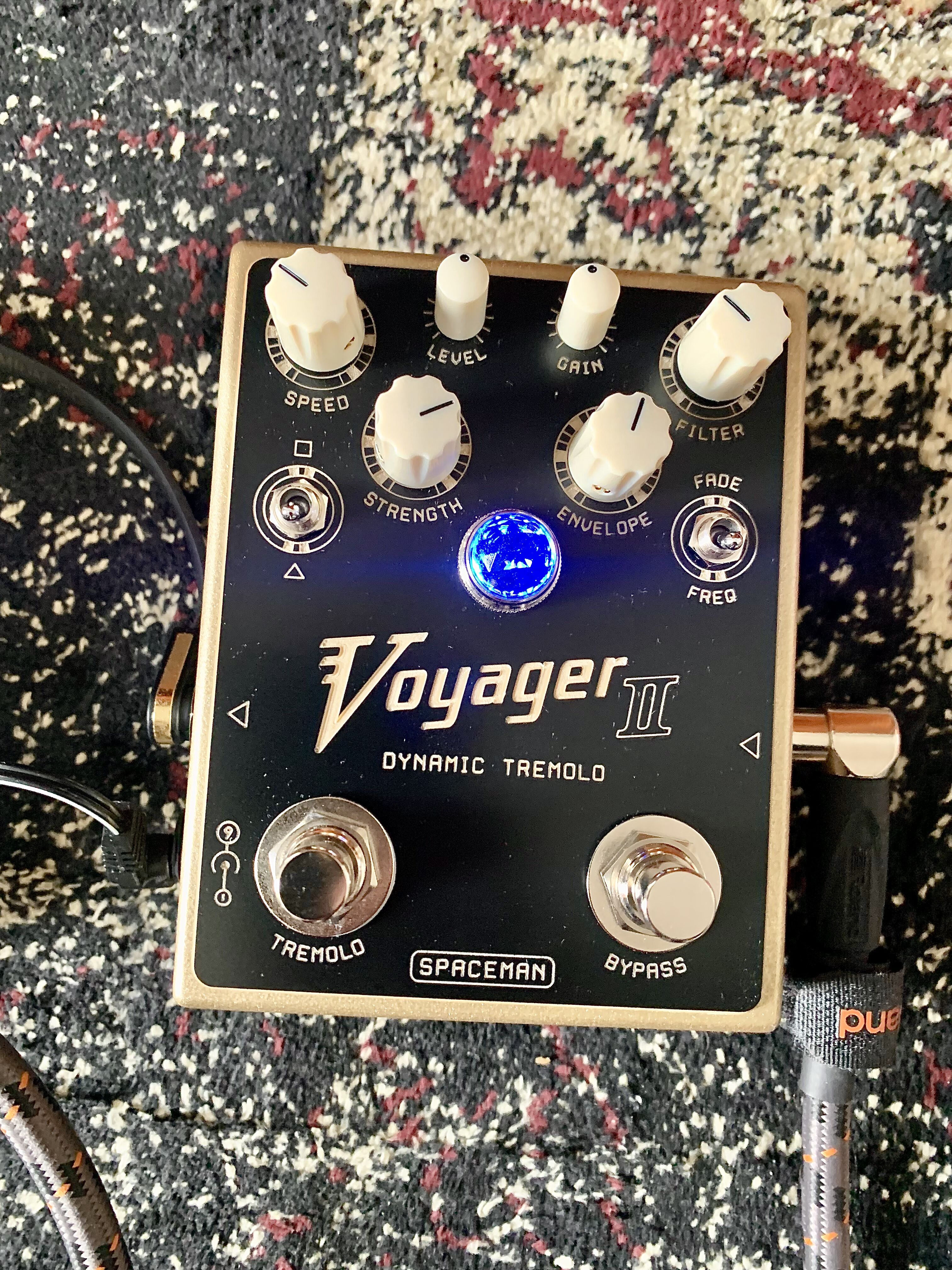 Pédale de trémolo Spaceman Effects Voyager 2, couleur Gold, pédale boutique made in USA.C’est un trémolo dynamique qui réagit à l’intensité du jeu. Il contient aussi un bel overdrive et des filtres pour moduler le son. Cette pédale est bien plus qu’un trémolo et permet d’aller dans différents styles de musiques.