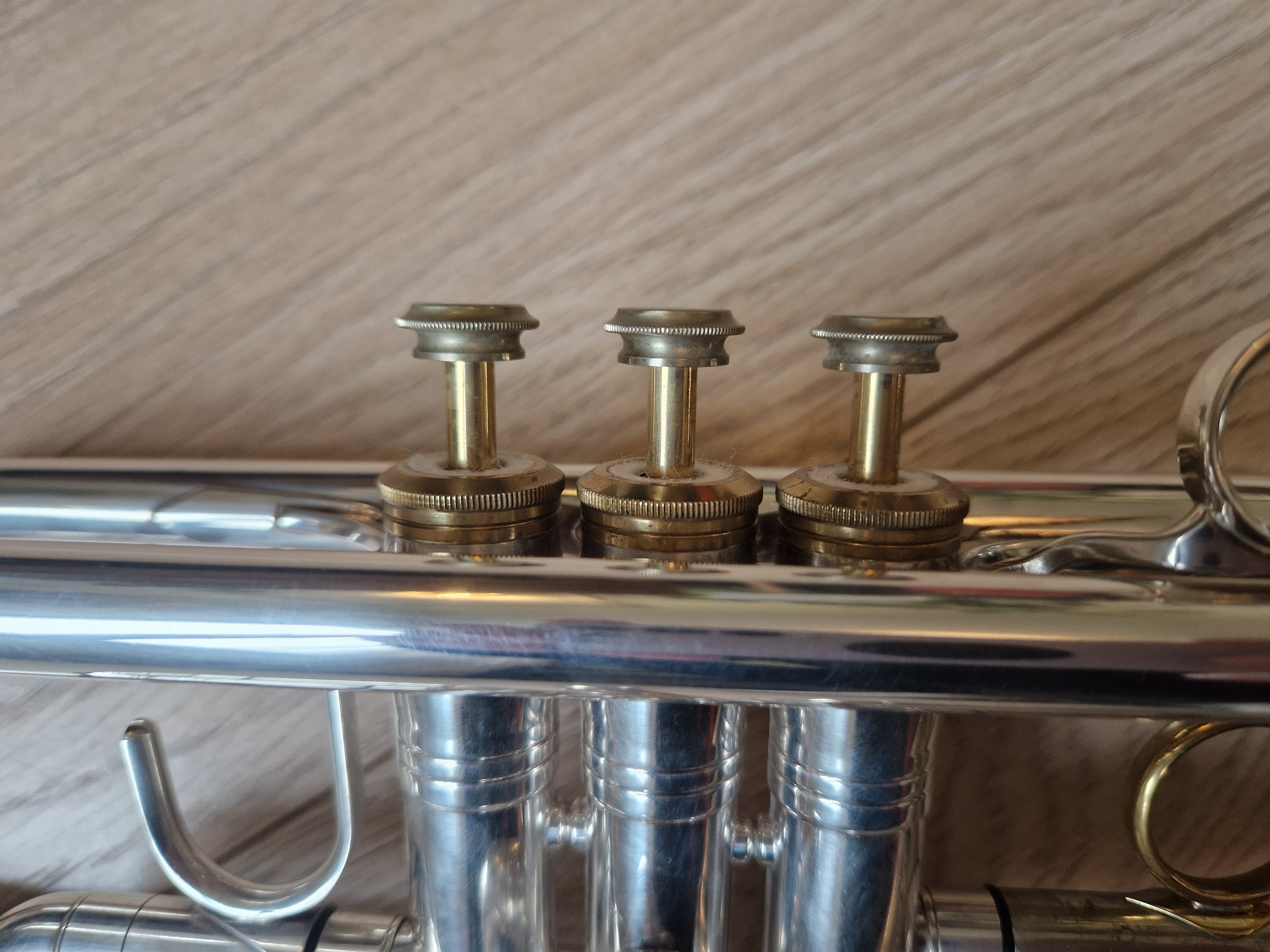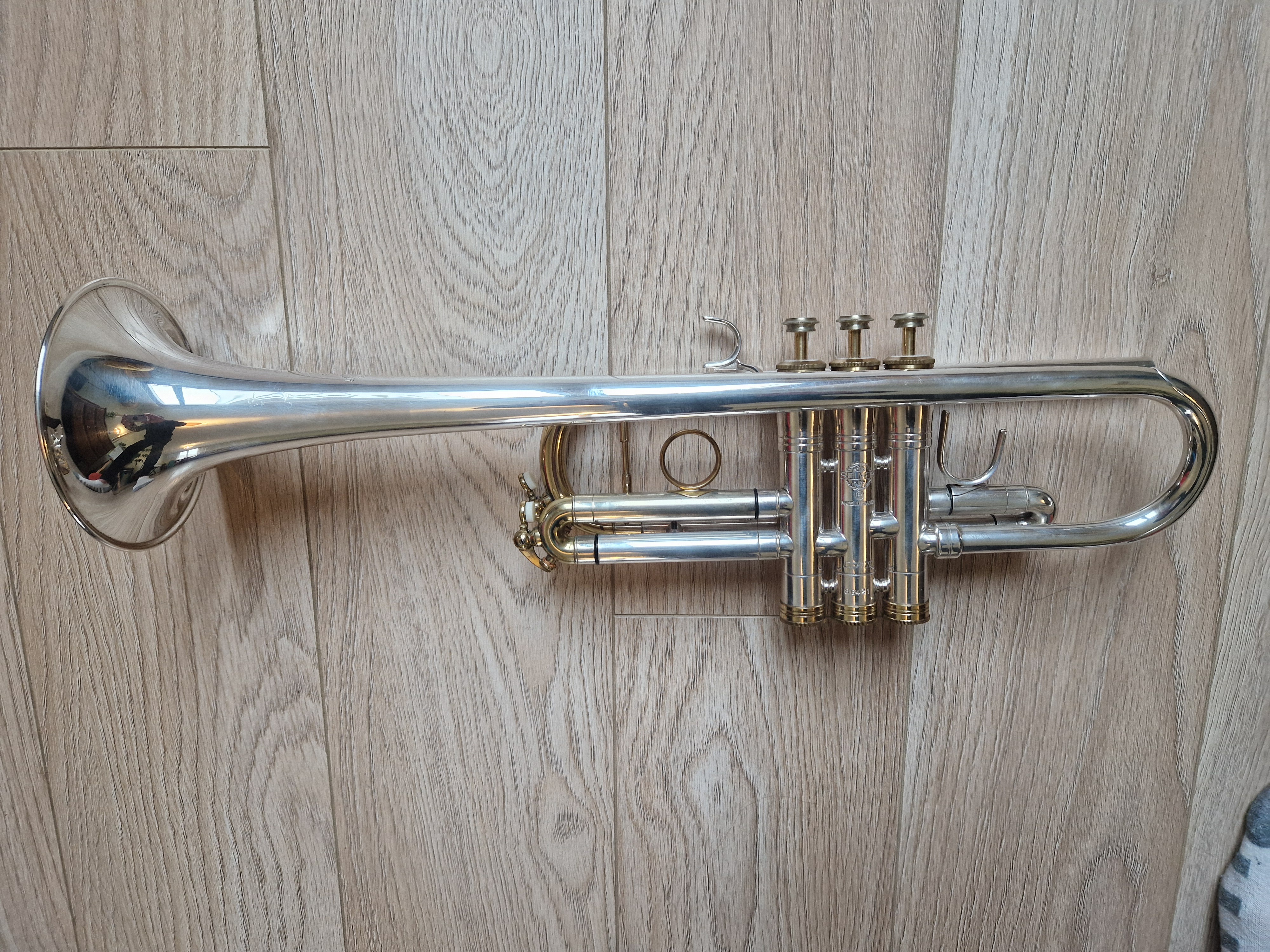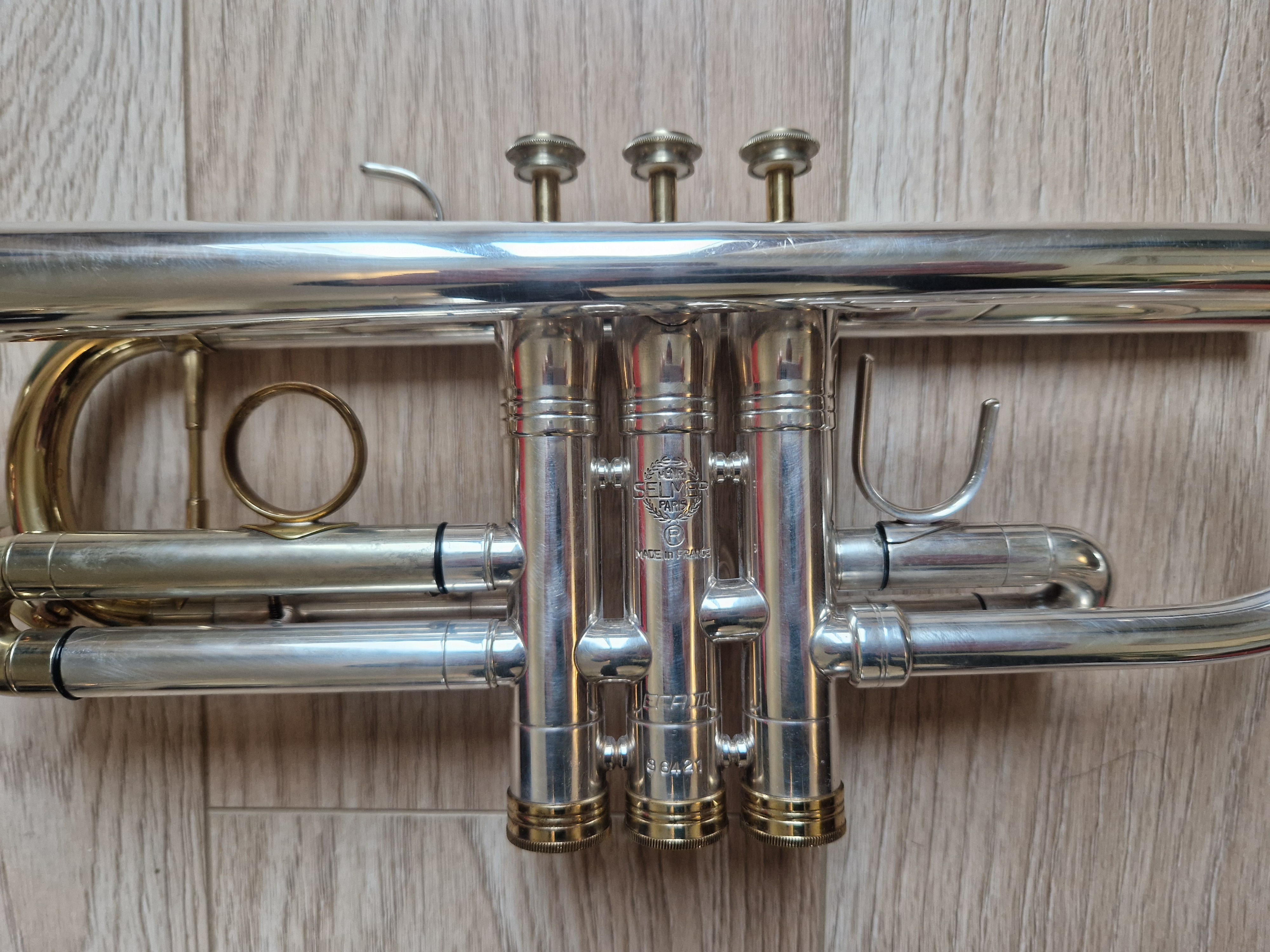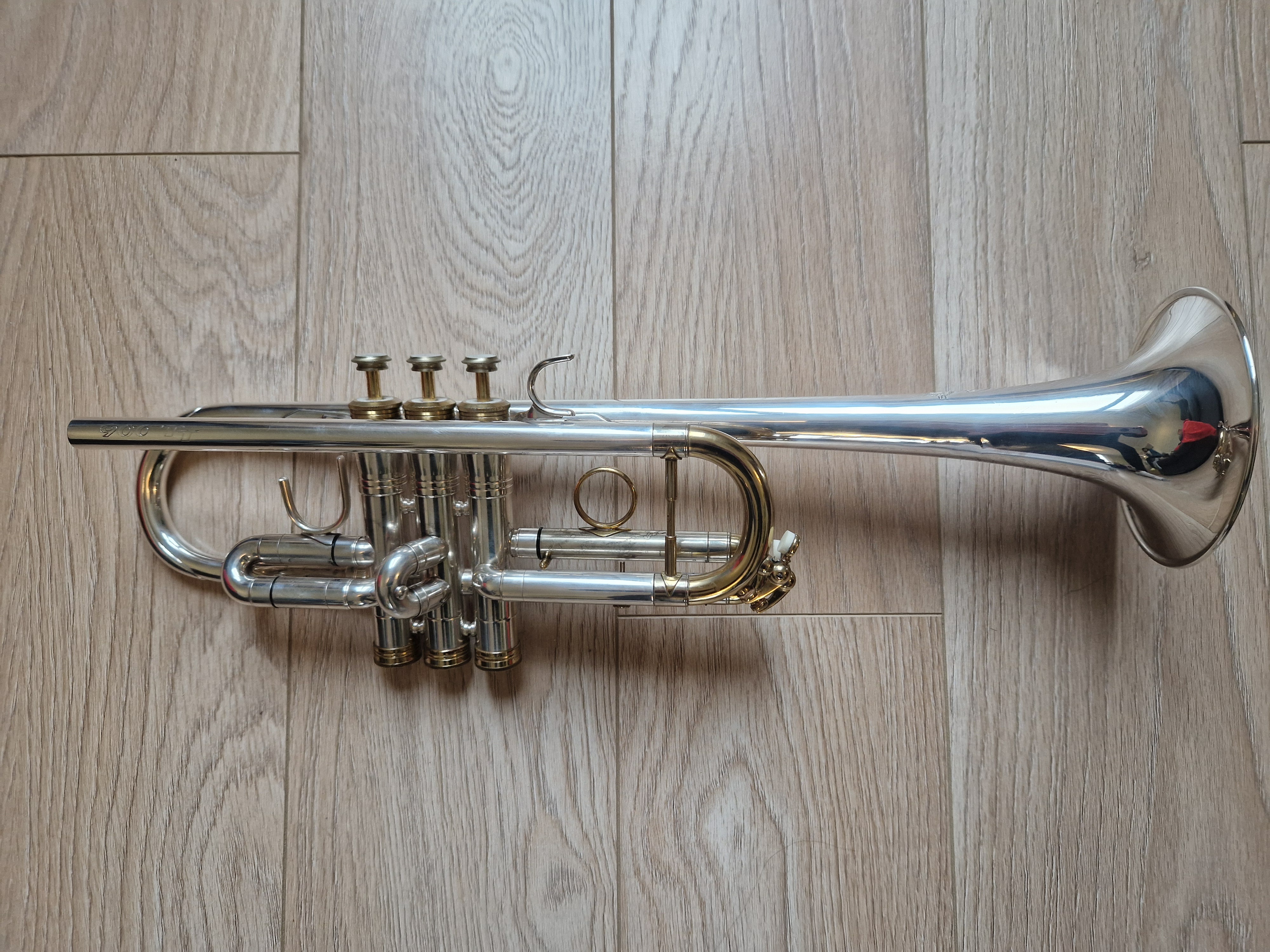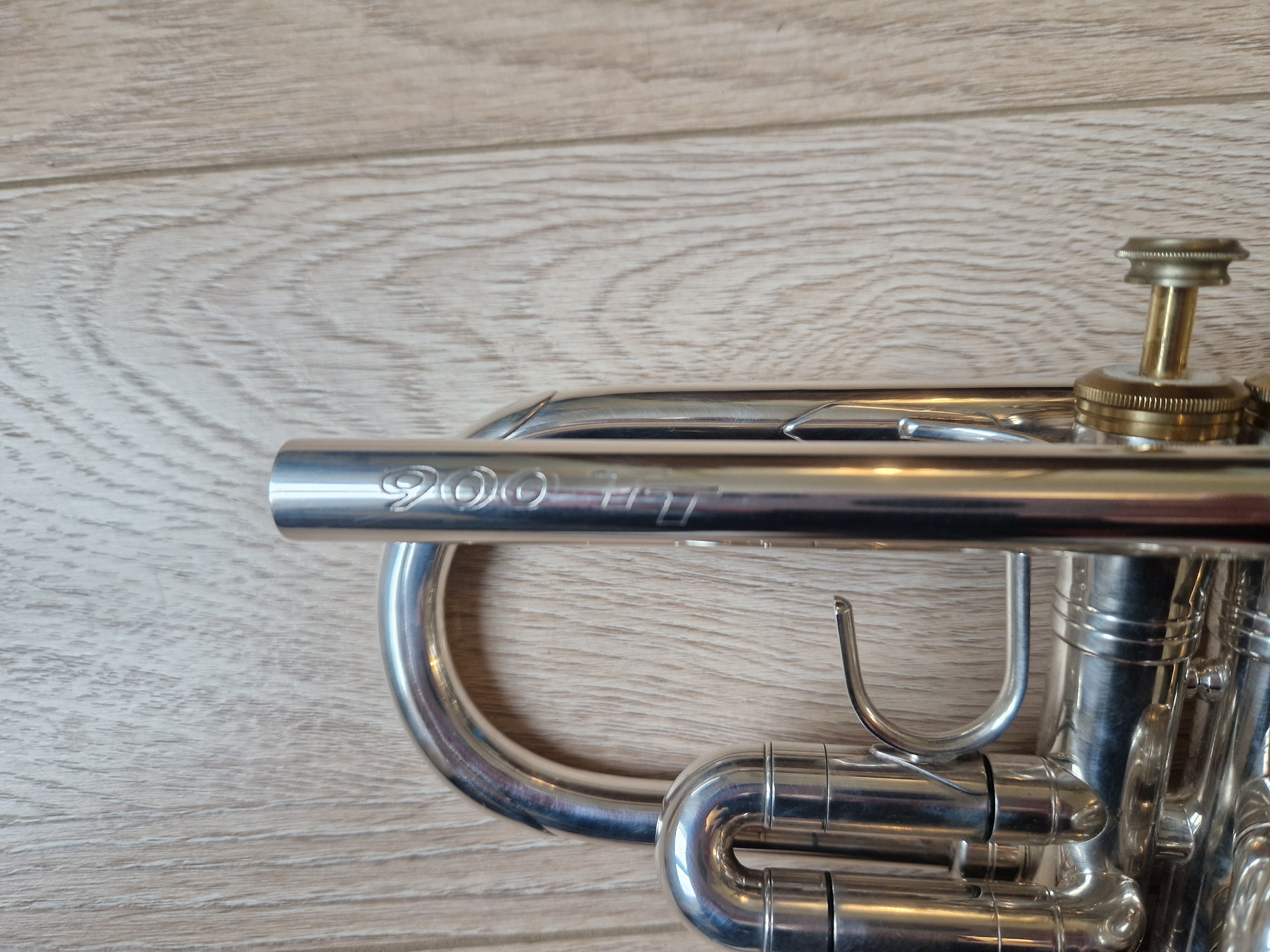 Trompette professionnelle en UT, Selmer 900TT (Twin Tube), finition argentée avec des accents vernis dorés.Très bon état général, très bonne compression, les pistons sont fluides et rapides.