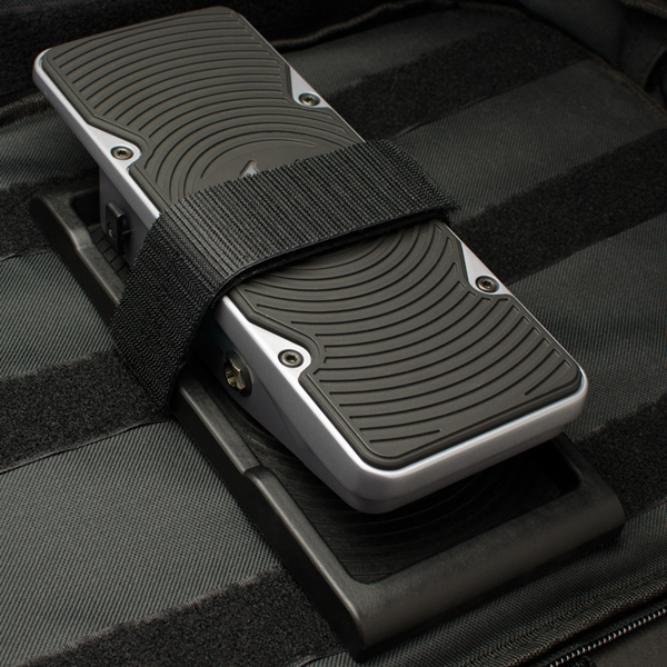 sous la forme d'une empreinte , fixable sur le PB, dans laquelle on posera la pédale, et qui est dotée d'un scratch pour tenir celle-ci quand on range le tout.