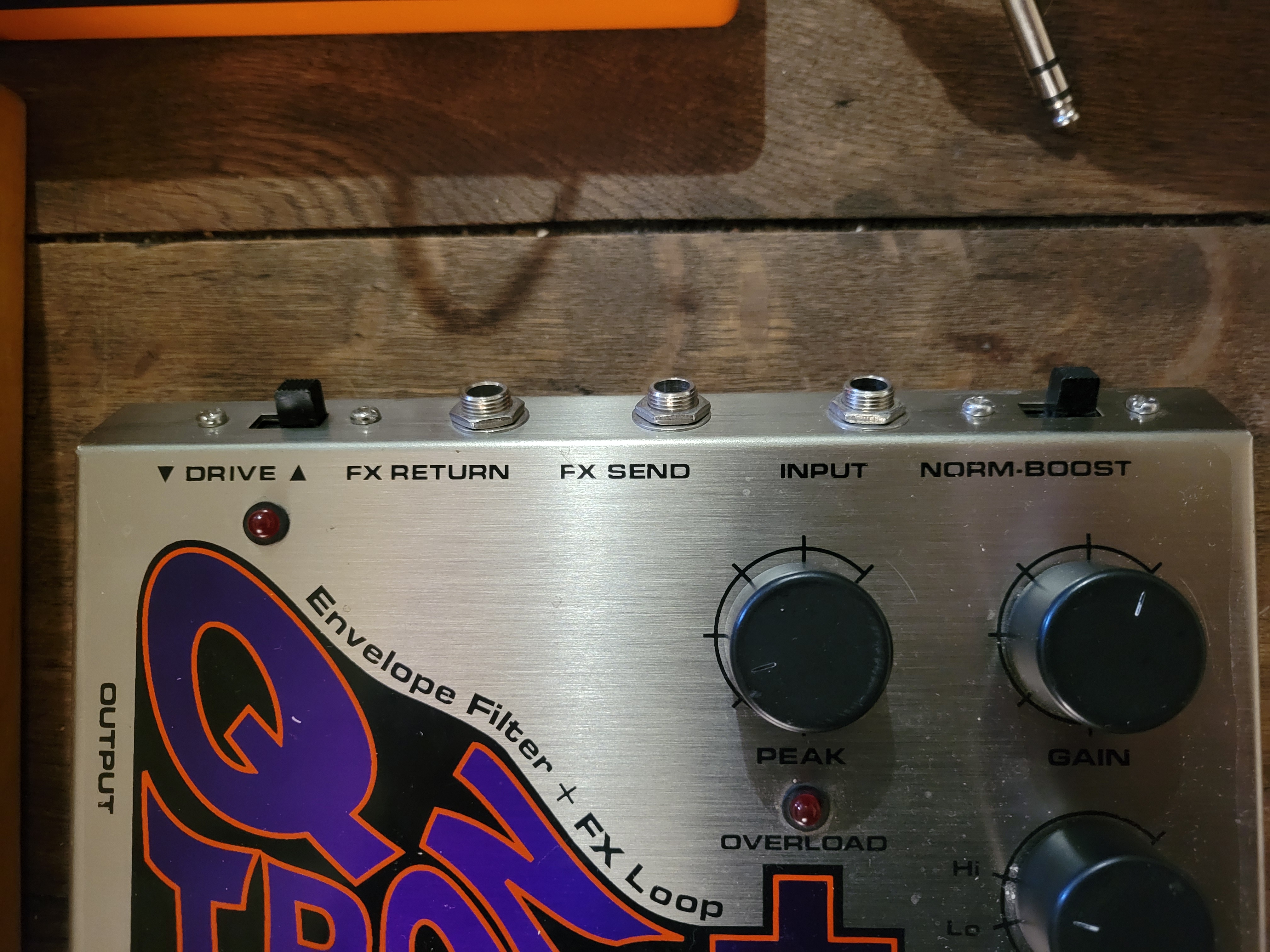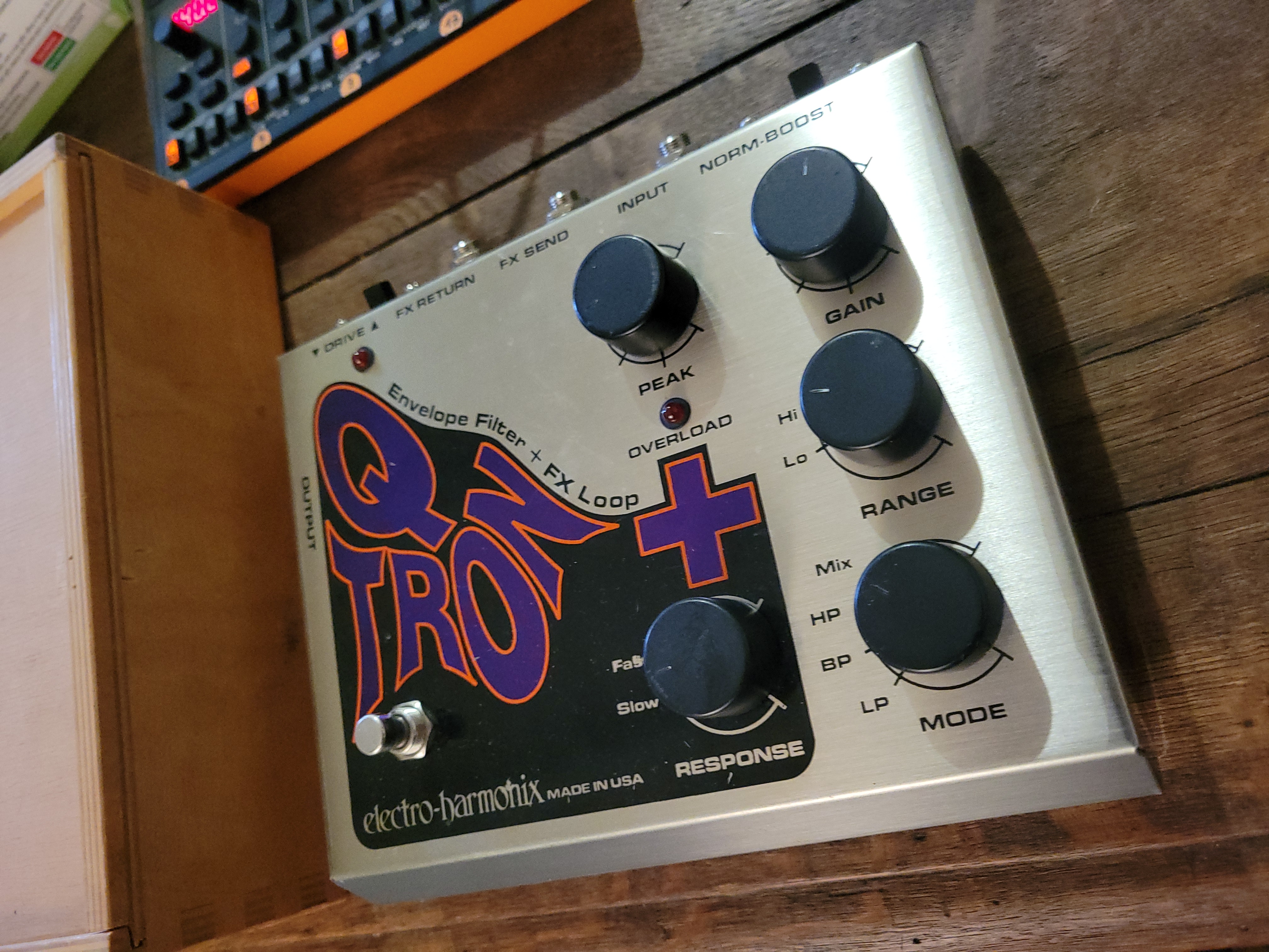 Le Q-Tron+ est un Filtre envelope filter avec en plus une boucle d'effet et un switch Response, une Distorsion et un Boost.
