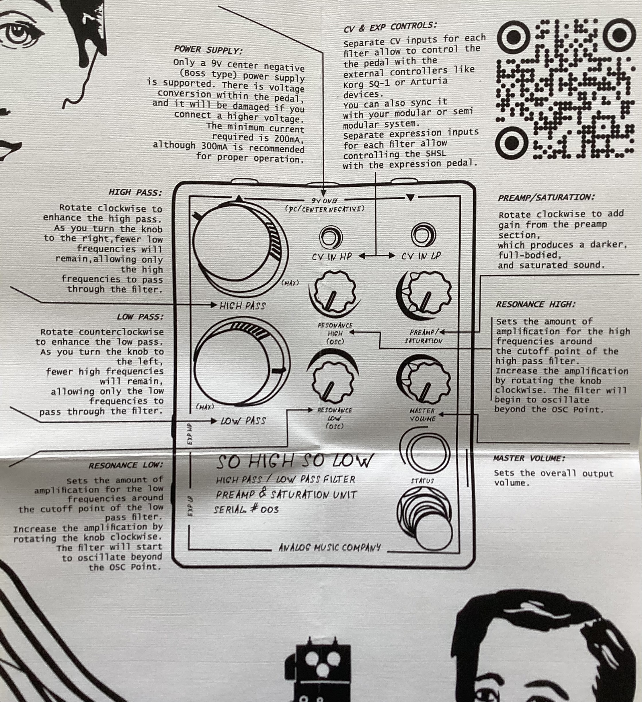 La So High So Low (SHSL) est un filtre passe-haut/passe-bas et préampli inspiré du Korg MS-20 et du Moogerfooger. Ses filtres résonants passe-haut et passe-bas, également inspirés du MS-20, offrent des réglages indépendants de fréquence de coupure et de résonance. Les filtres sont montés en série et leur résonance est ajustable. Au-delà de leur point d'oscillation, chaque filtre entre en auto-oscillation et peut être utilisé comme oscillateur contrôlé par CV. Le SHSL dispose d'une section de préamplification dédiée, inspirée des pédales Moogerfooger, qui apporte une belle coloration au son. Cette section de préamplification propose différents modes, allant d'une légère saturation à une distorsion poussée. Des entrées CV séparées pour chaque filtre permettent de contrôler la pédale avec des contrôleurs externes tels que le Korg SQ-1 ou les appareils Arturia. Il est également possible de la synchroniser avec un système modulaire ou semi-modulaire. Enfin, des entrées d'expression séparées pour chaque filtre permettent de contrôler le SHSL avec une pédale d'expression.