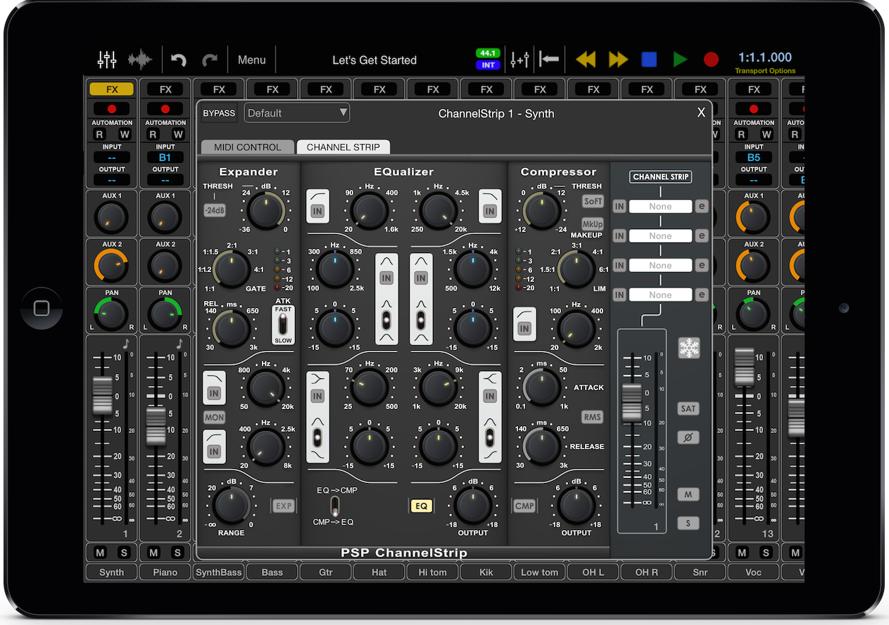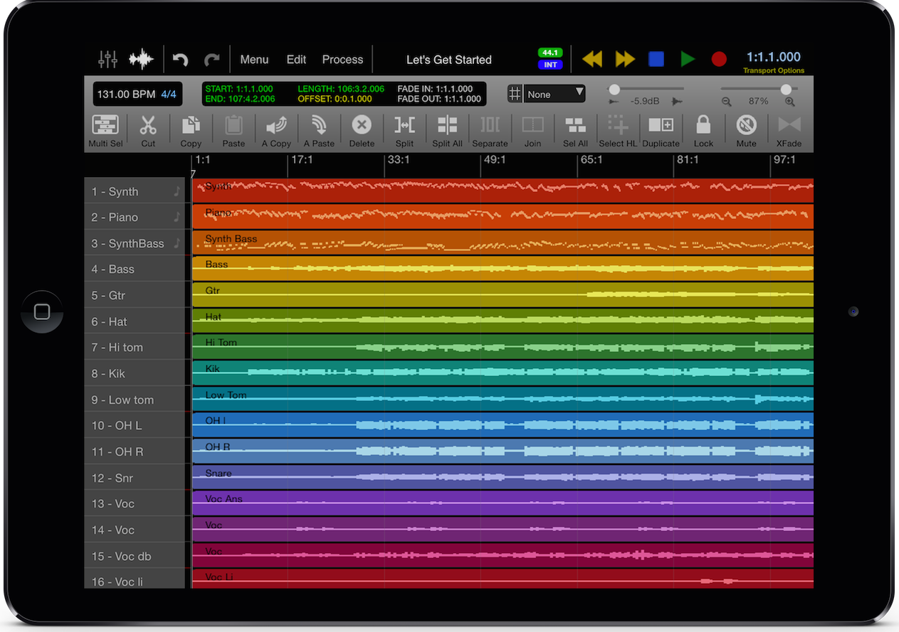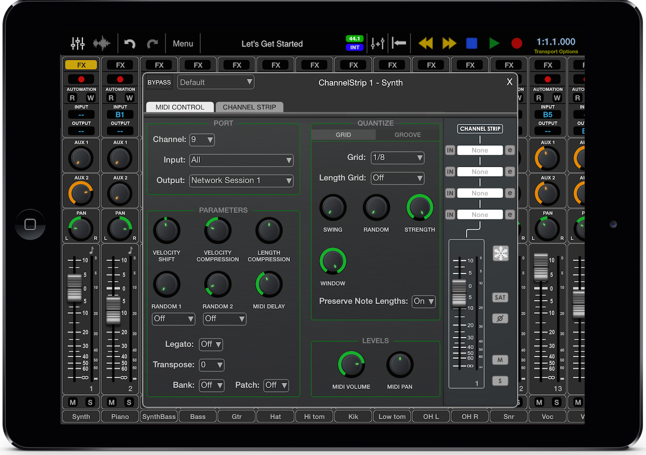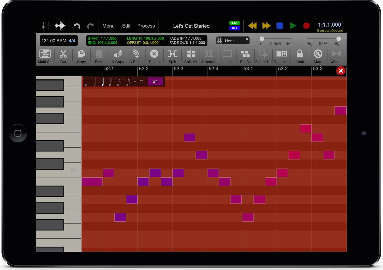 - Nouvelles fonctionnalités MIDI : séquenceur, pistes de tempo et de signature temporelle, éditeur piano roll, paramètres en temps réel de quantisation, vélocité, longueur, random, délai, legato et transposition, quantisation des template de groove avec les grooves DNA (et d’autres via achat in-app), diverses fonctions de traitement (transposition, longueur, gain, vélocité, suppression de notes, de contrôleur, restriction de la polyphonie, humanisation, inversions, crescendo, compresseur/limiteur…)