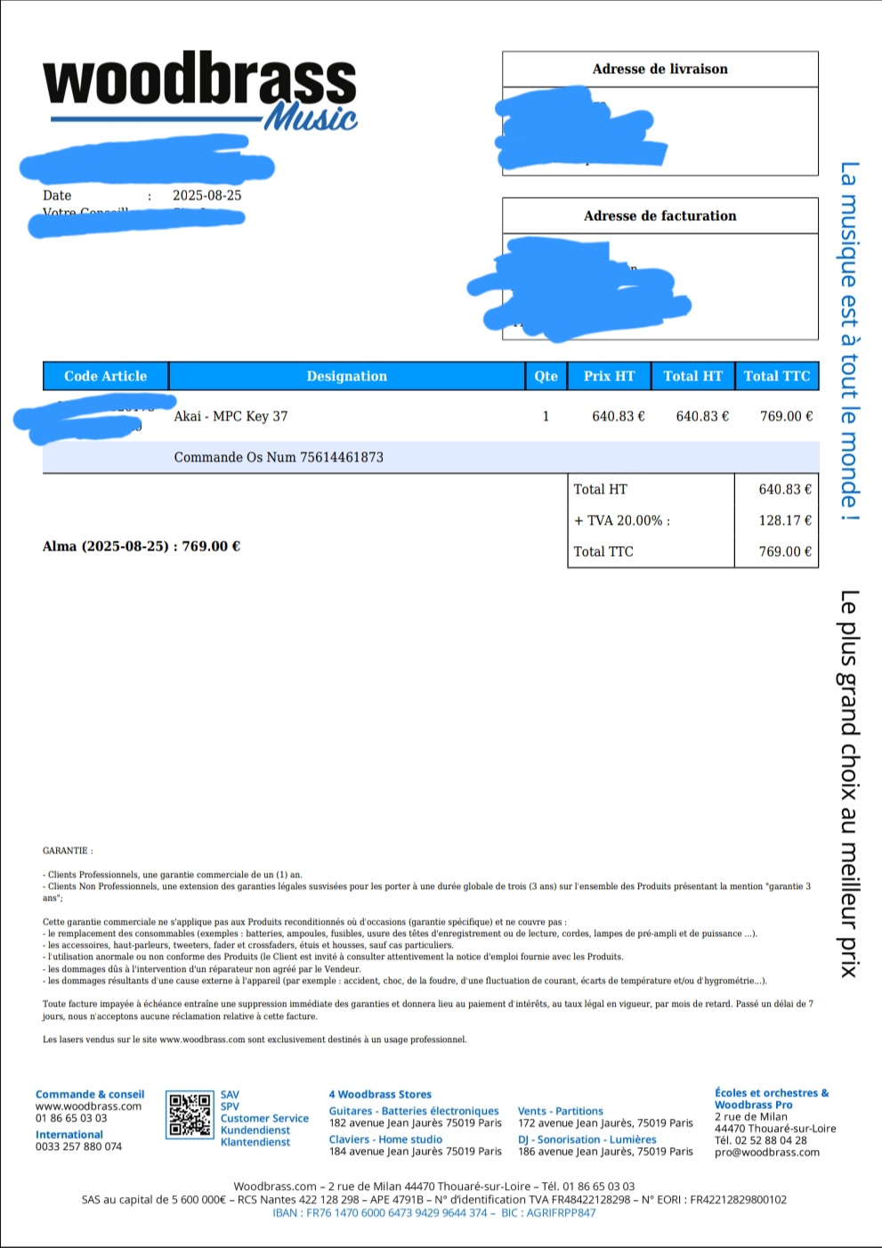 Elle est en très bon état, acheté en août 2025 sur woodbrass. (La facture est en photo, si la transaction aboutie je vous enverrai la version originale non raturé)