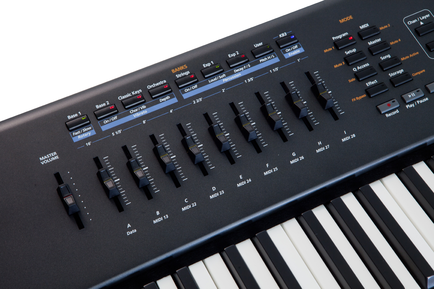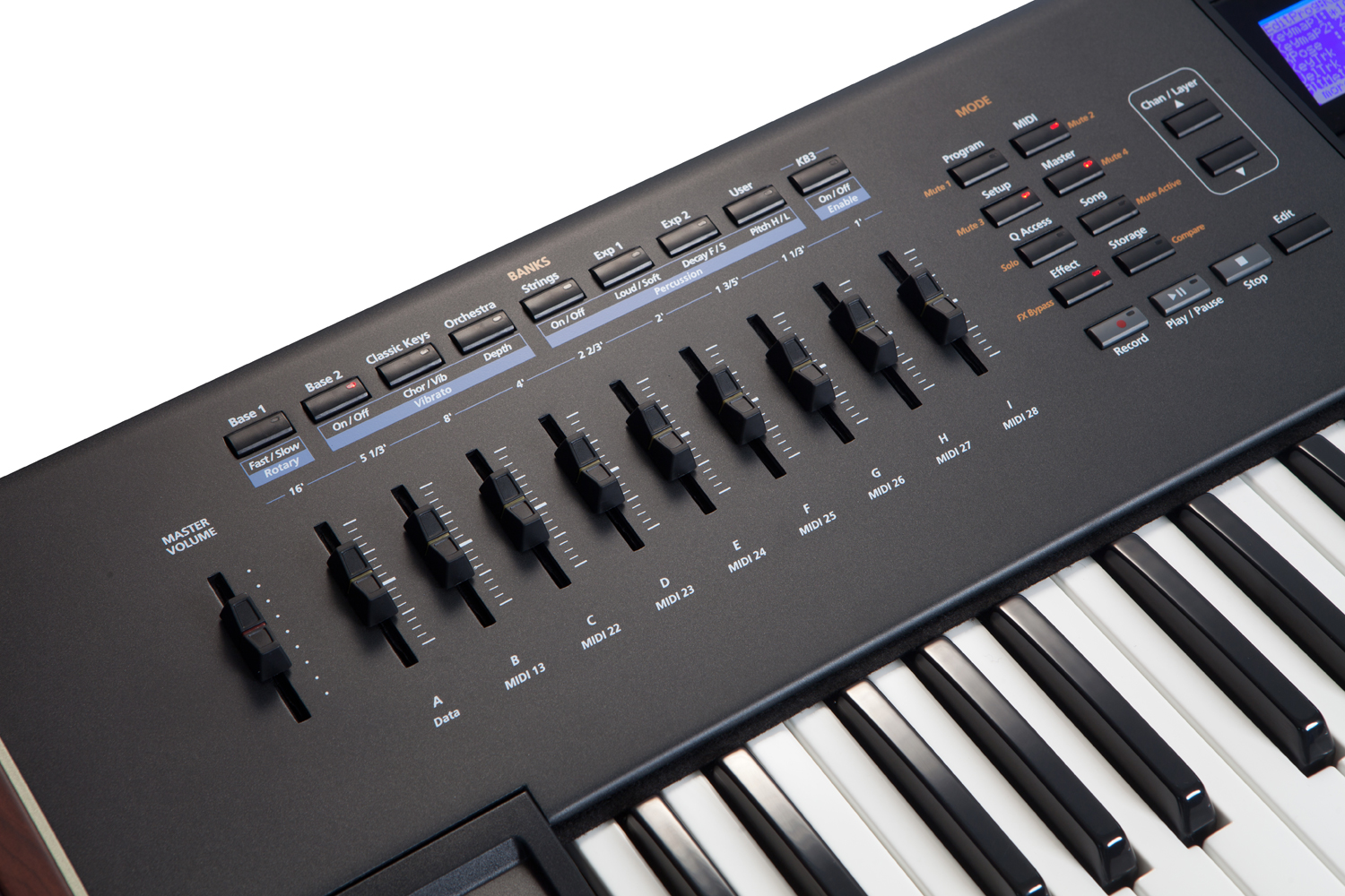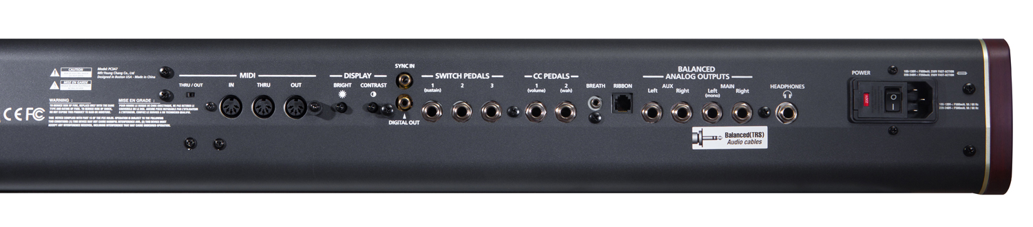 Enfin, la connectique inclut un trio MIDI, un port USB MIDI et un autre pour brancher une clé, des entrées pour pédales de switch et de contrôle continu, une entrée pour Super Ribbon, une entrée pour breath controller et une sortie casque sur jack. Les sorties numériques S/PDIF supportent une résolution de 24 bits / 44.1 à 192 kHz stéréo.