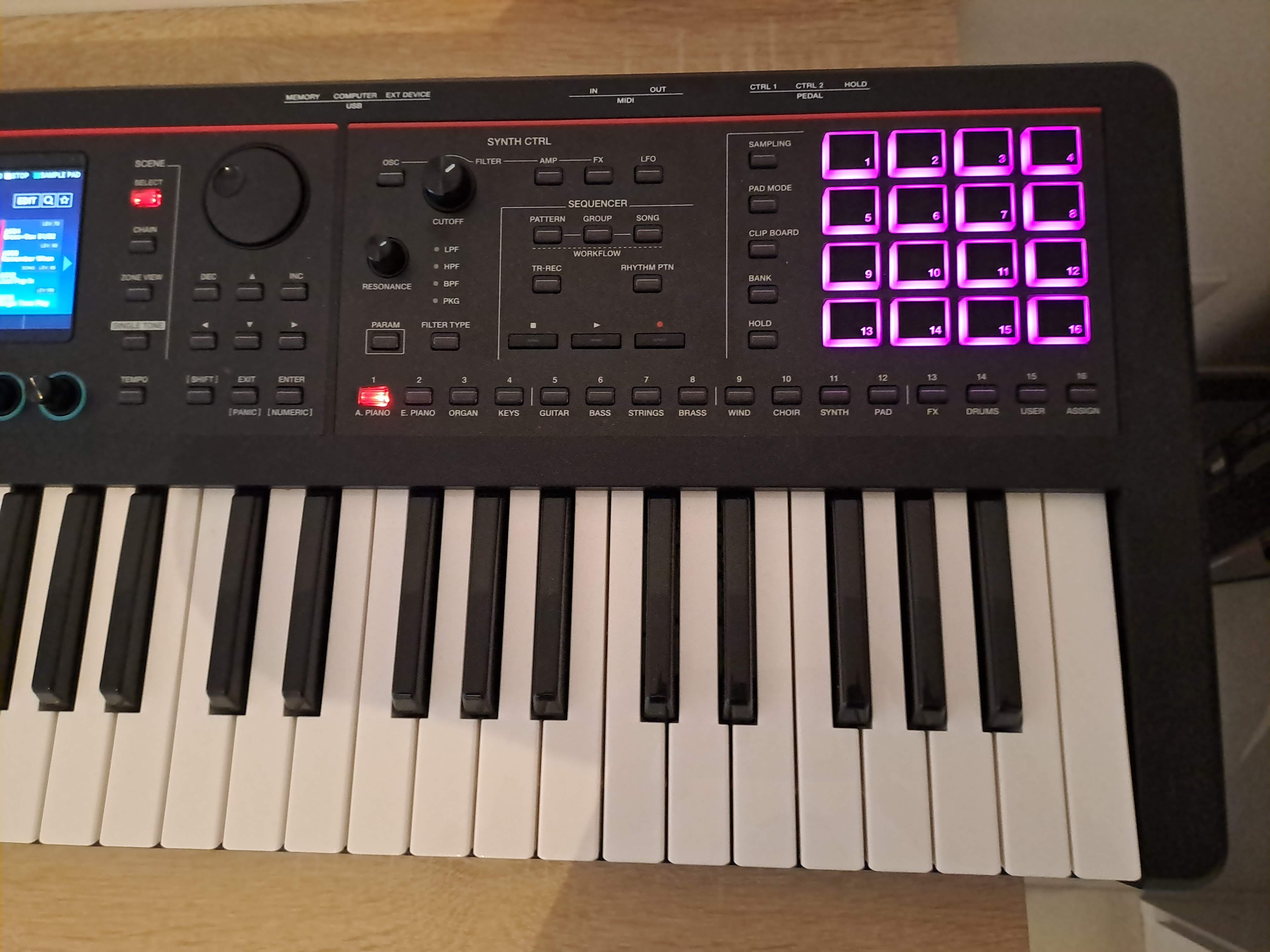 Attentes: Bien que workstation, je voulais un synthé simple à utiliser (merci aux écrans tactile), une grosse banque de son (+ 3500 c'est largement bien pour s'occuper), la possibilité de faire du layering/split et modifier les paramètres des instruemnts, un clavier compact (61touches) qui puisse rentrer dans mon coffre et non rester sur ma banquette arrière. Et de surcroit, éviter la complication d'un clavier midi avec ordinateur et carte son.