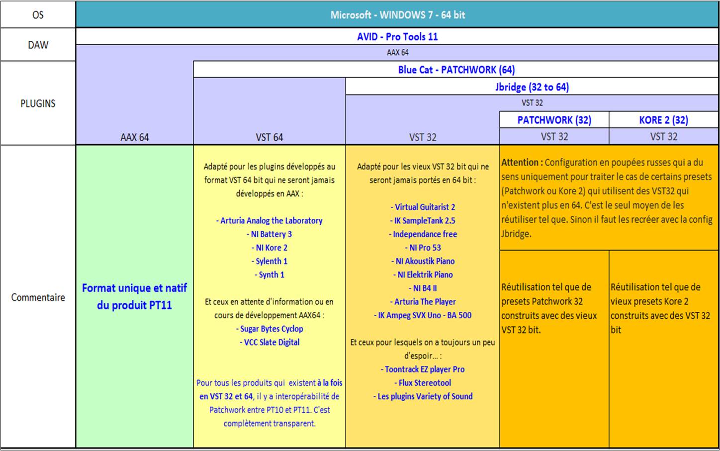 Dans Protools 11, C’est Patchwork avec un noyau 64bit qui fonctionne et qui ne peut ouvrir que des plugins VST 64bit. Il est donc impossible d’ouvrir un VST32 dans Patchwork AAX64.