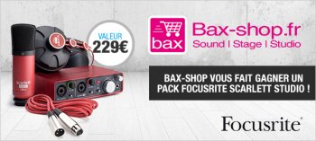 Le pack que Bax Shop vous fait gagner en cette rentrée est constitué d’une interface audio USB Scarlett 2i2, d’un casque fermé Scarlett Studio HP60, d’un micro à condensateur et large diaphragme Scarlett Studio CM25, d’un câble XLR et d’une suite logicielle complète comprenant la STAN Cubase LE, le synthé virtuel Novation bass Station, 1 Go d’échantillons sonores de chez Loopmasters, et de la Scarlett Plug-In Suite avec un compresseur, une réverbe, un égaliseur et une gate.